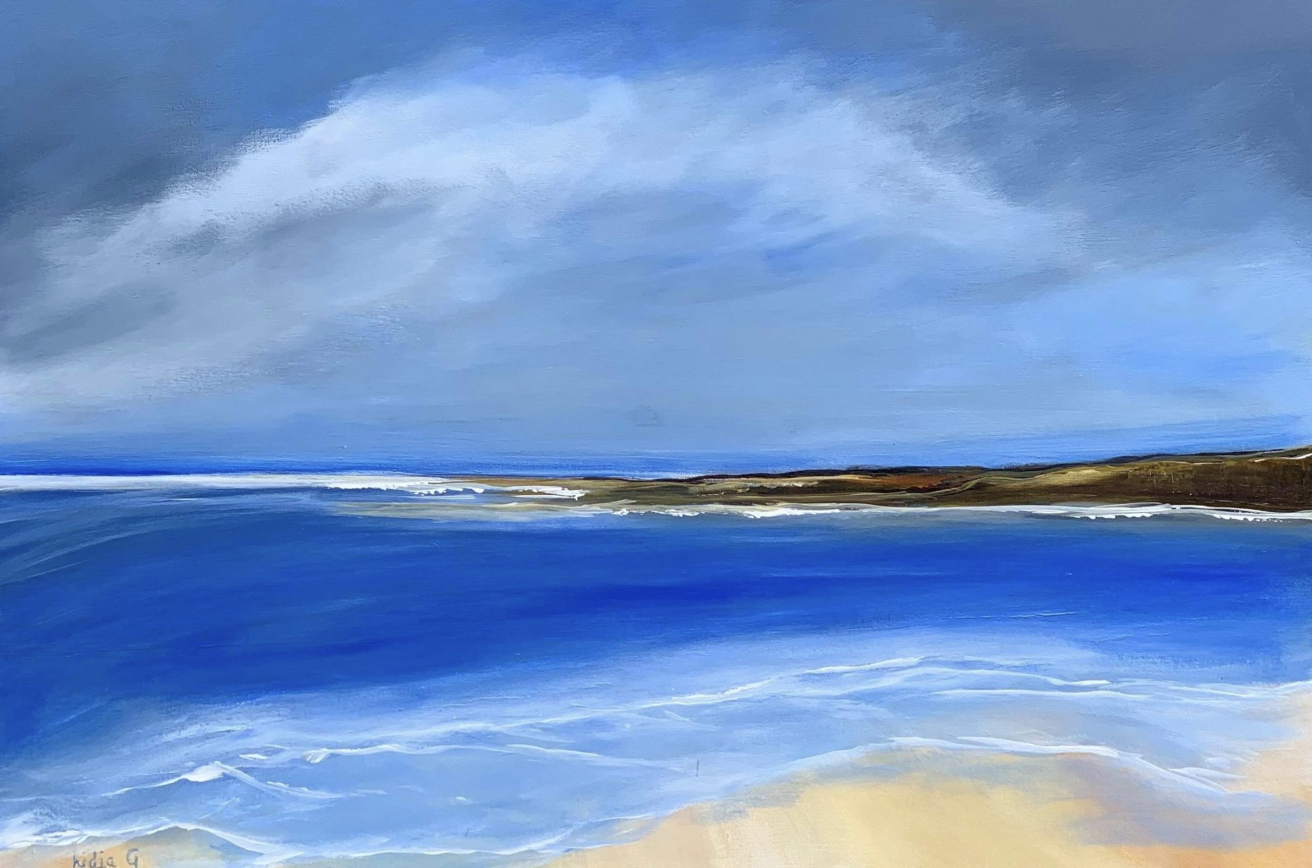 ‘New horizons” is painted in rich hues of cobalt blue, Australian sienna, Payne’s grey, sand yellow and titanium white. It comes with a professional wire hanger and a Certificate of Authenticity.