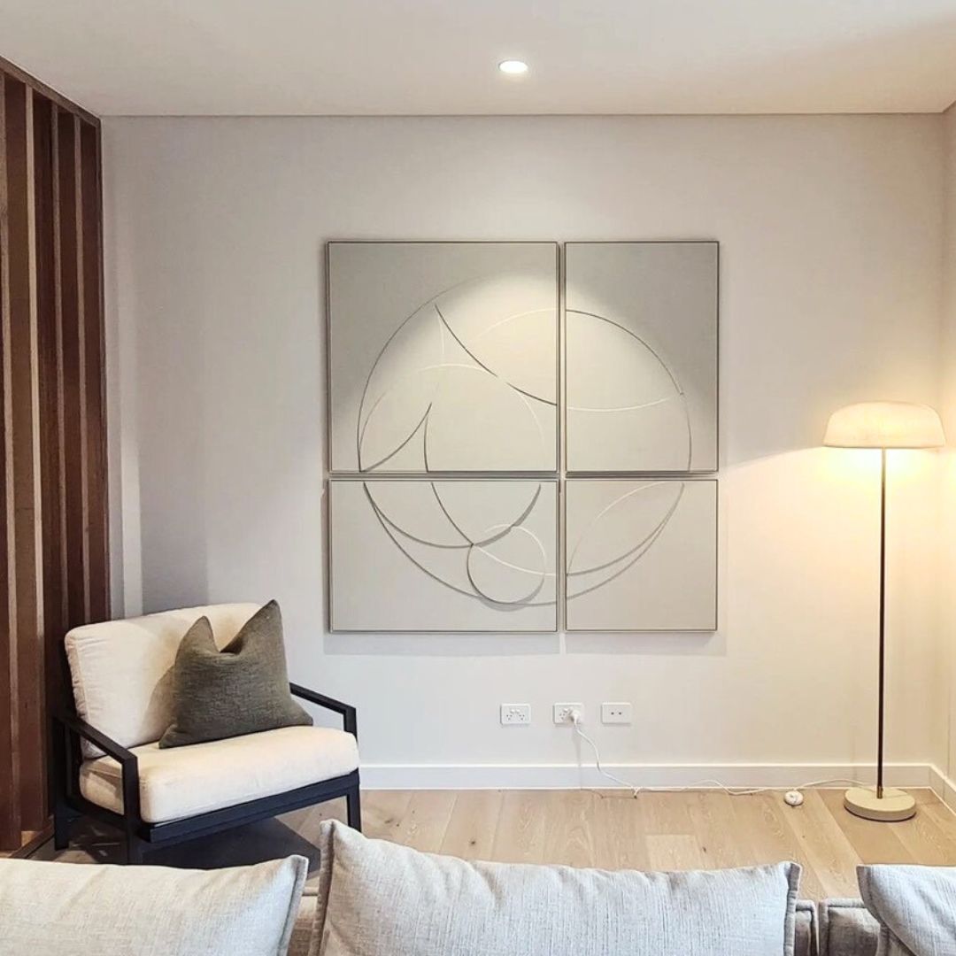 ‘New Moon’ is a sculptural four-panel composition that draws from the moon’s quiet power — symbolic of renewal, feminine energy, and emotional rhythm.