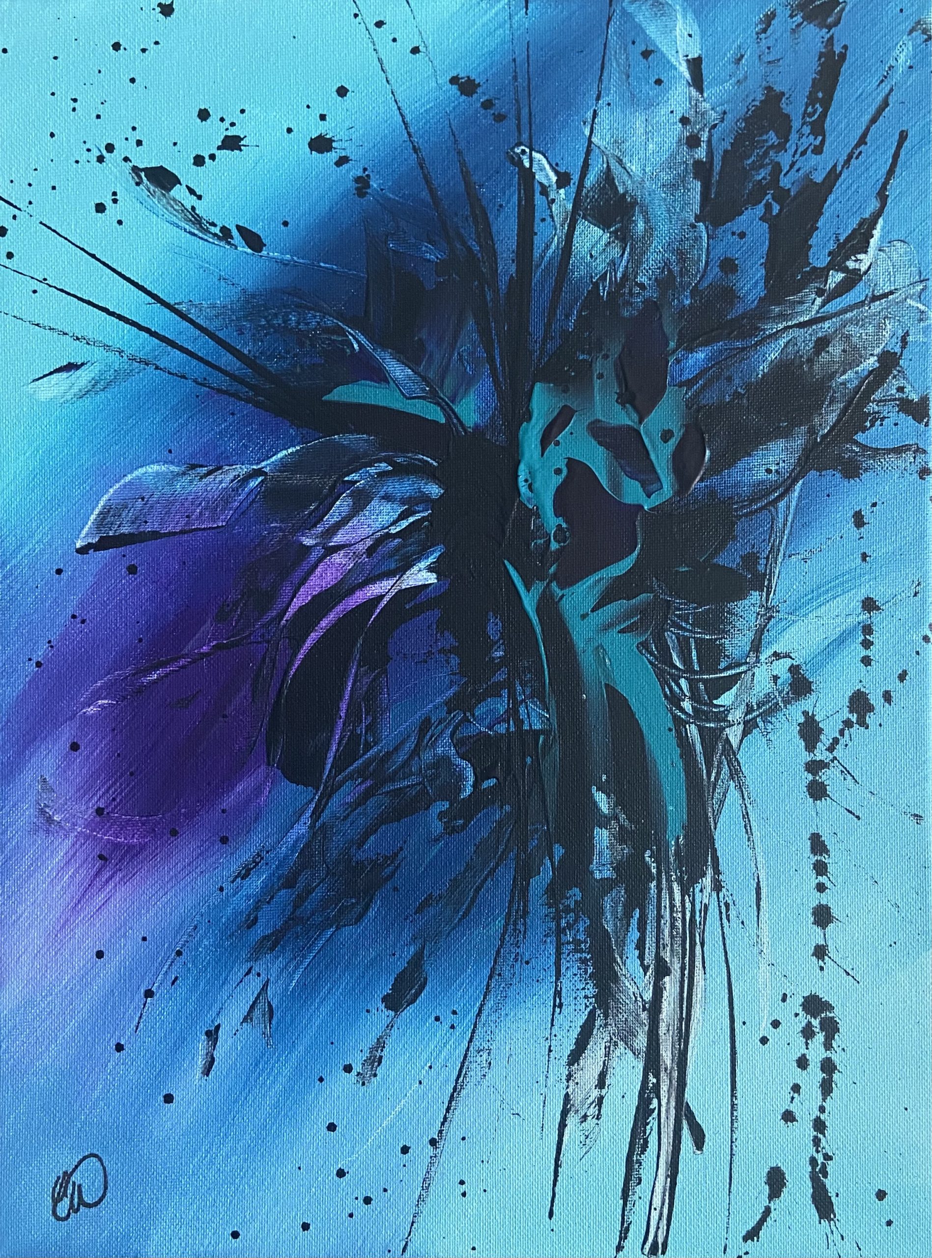 New Persuit by Carrie Welsh is a striking abstract piece with deep colours. This will look great in any room! 30 x 40cm. Acrylic on canvas, ready to hang.
