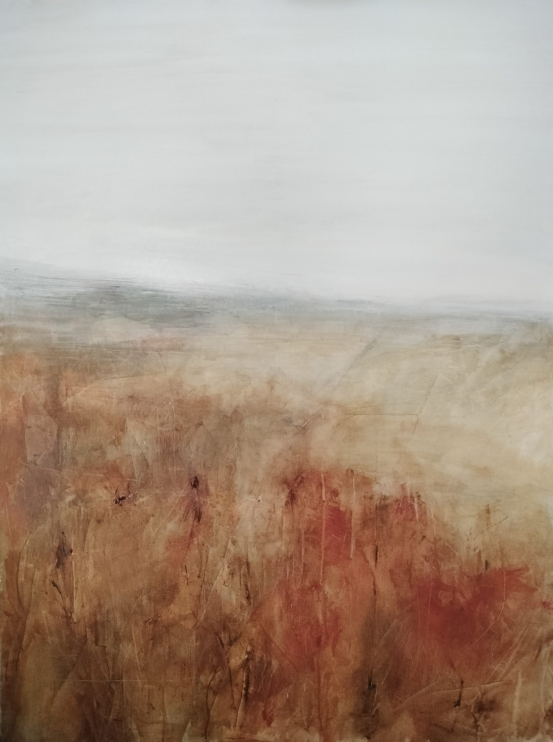 “Nice to be Here” portrays a hillside setting in a soothing palette of ochre, brown and neutral tones, evoking a sense of serene contentment. The hillside terrain is rendered with warm, rich and earthy colours, creating a harmonious and inviting landscape. The brushstrokes subtly capture the texture of the hill, with highlights of reddish ochre illuminating the painting and tones of brown adding contrast, depth and dimension. A soft, diffused light bathes the scene, enhancing the feeling of peaceful solitude and an unspoken appreciation for the simple beauty of the natural world. The painting invites viewers to pause and savor the tranquil essence of being present in this idyllic setting. In essence, simply being ‘nice to be here’.