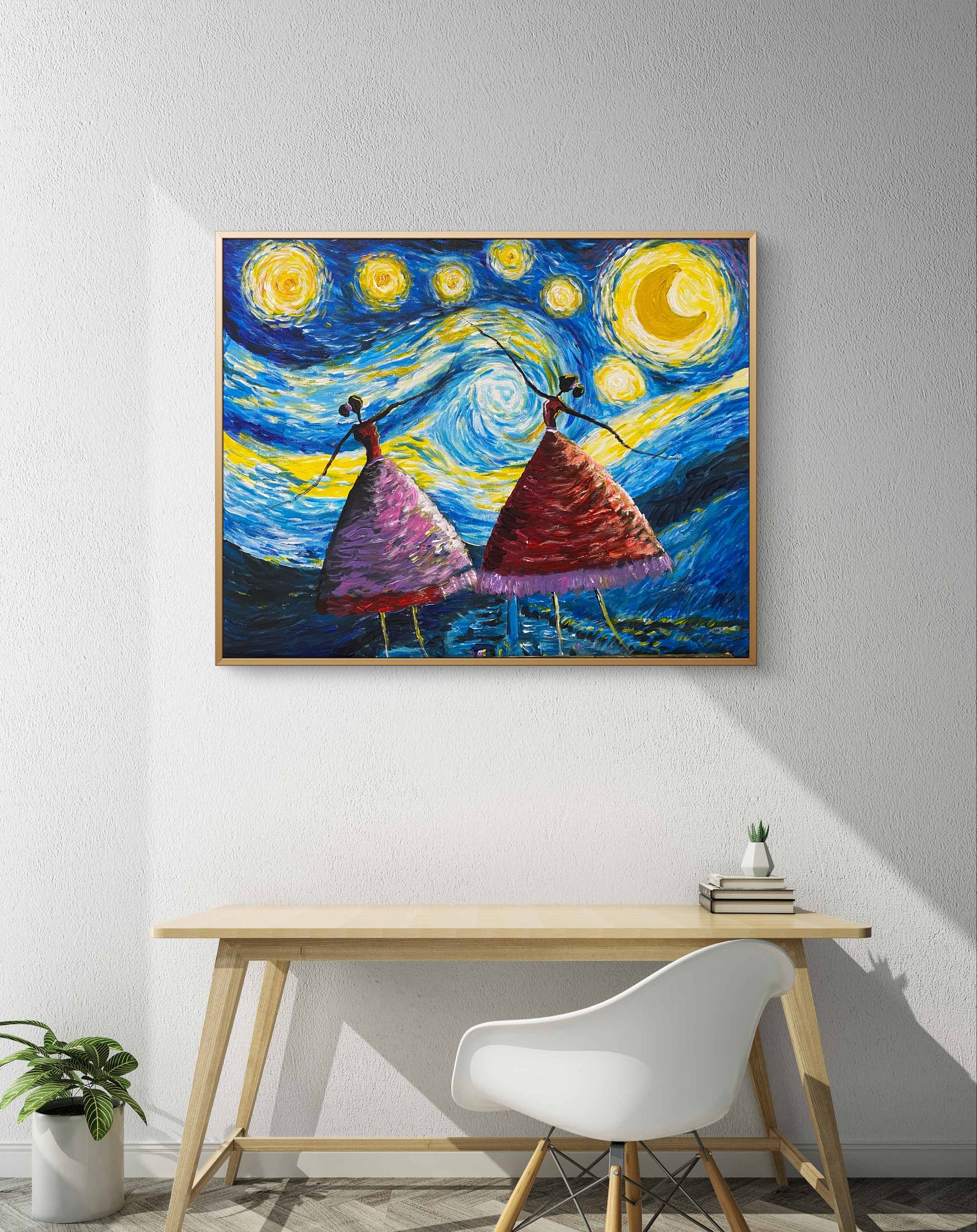 Night Balerina Mini by Mahesh Aluthge (Maashi) – A mesmerizing blend of movement and light, this abstract painting captures the joy and energy of dancing under a cosmic sky. The background, inspired by a starry night, glows with deep blues and radiant yellows, setting the stage for a lively display of color and rhythm. The dancers, adorned in bright, flowing dresses, swirl and twirl in a harmonious celebration of life and freedom. Their vibrant forms create a captivating contrast against the celestial backdrop, evoking a sense of movement, passion, and spontaneity. A perfect statement piece for those who appreciate art that embodies joy and motion.