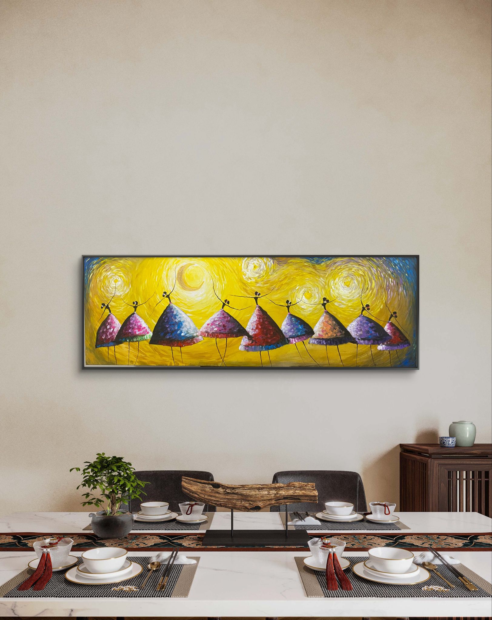 Night Balerina by Mahesh Aluthge (Maashi) – A mesmerizing blend of movement and light, this abstract painting captures the joy and energy of dancing under a cosmic sky. The background, inspired by a starry night, glows with deep blues and radiant yellows, setting the stage for a lively display of color and rhythm. The dancers, adorned in bright, flowing dresses, swirl and twirl in a harmonious celebration of life and freedom. Their vibrant forms create a captivating contrast against the celestial backdrop, evoking a sense of movement, passion, and spontaneity. A perfect statement piece for those who appreciate art that embodies joy and motion.