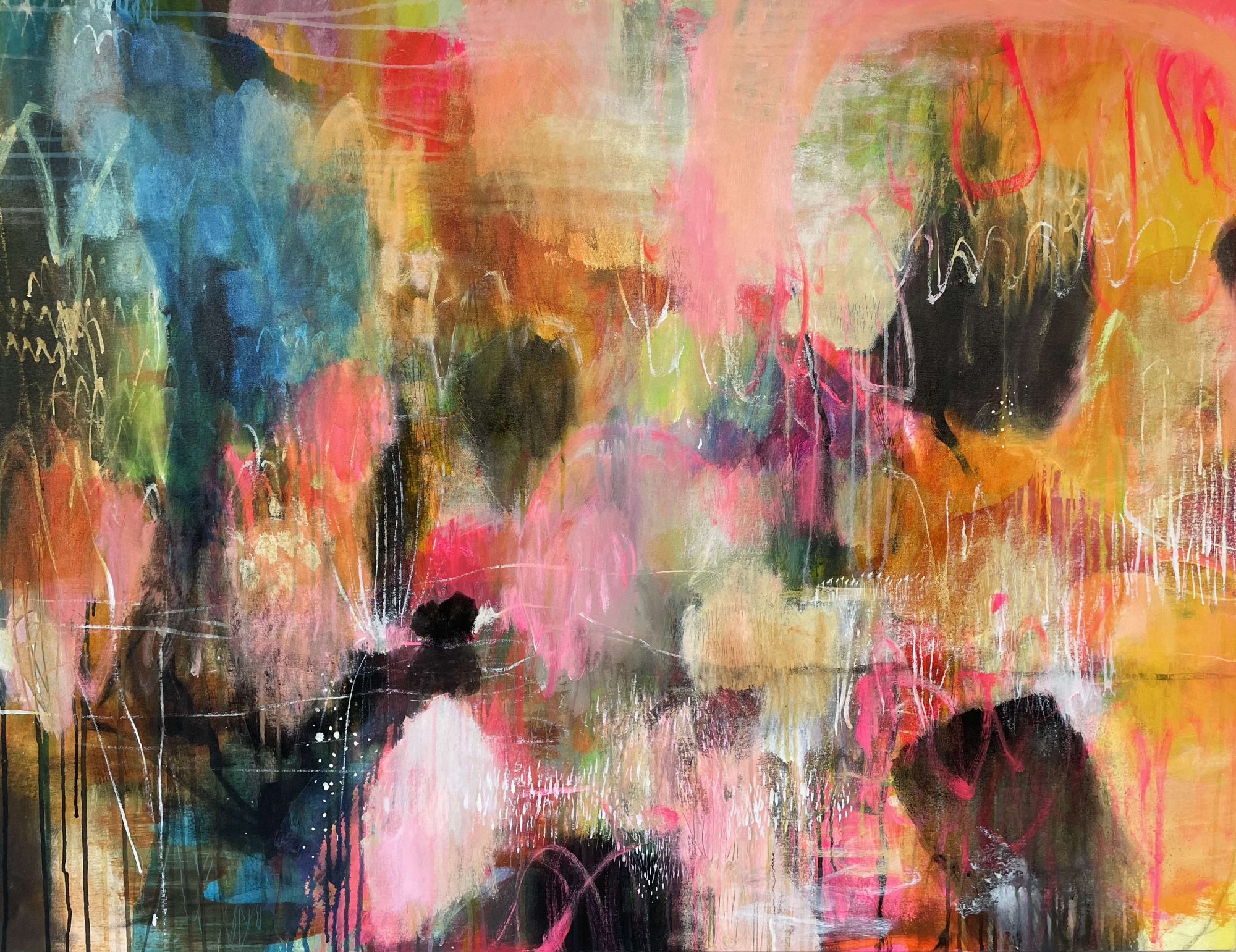 Night Fantasy by Gabbi Lancaster – Lately I am feeling so excited by making abstract art! I love painting with no outcome in mind… absorbed in the moment, responding and in a dialog with each new visual moment. This painting was painted over a few night sessions. The light is different, the sounds from the garden are different and I really allowed myself the freedom to do exactly what made me happy.
