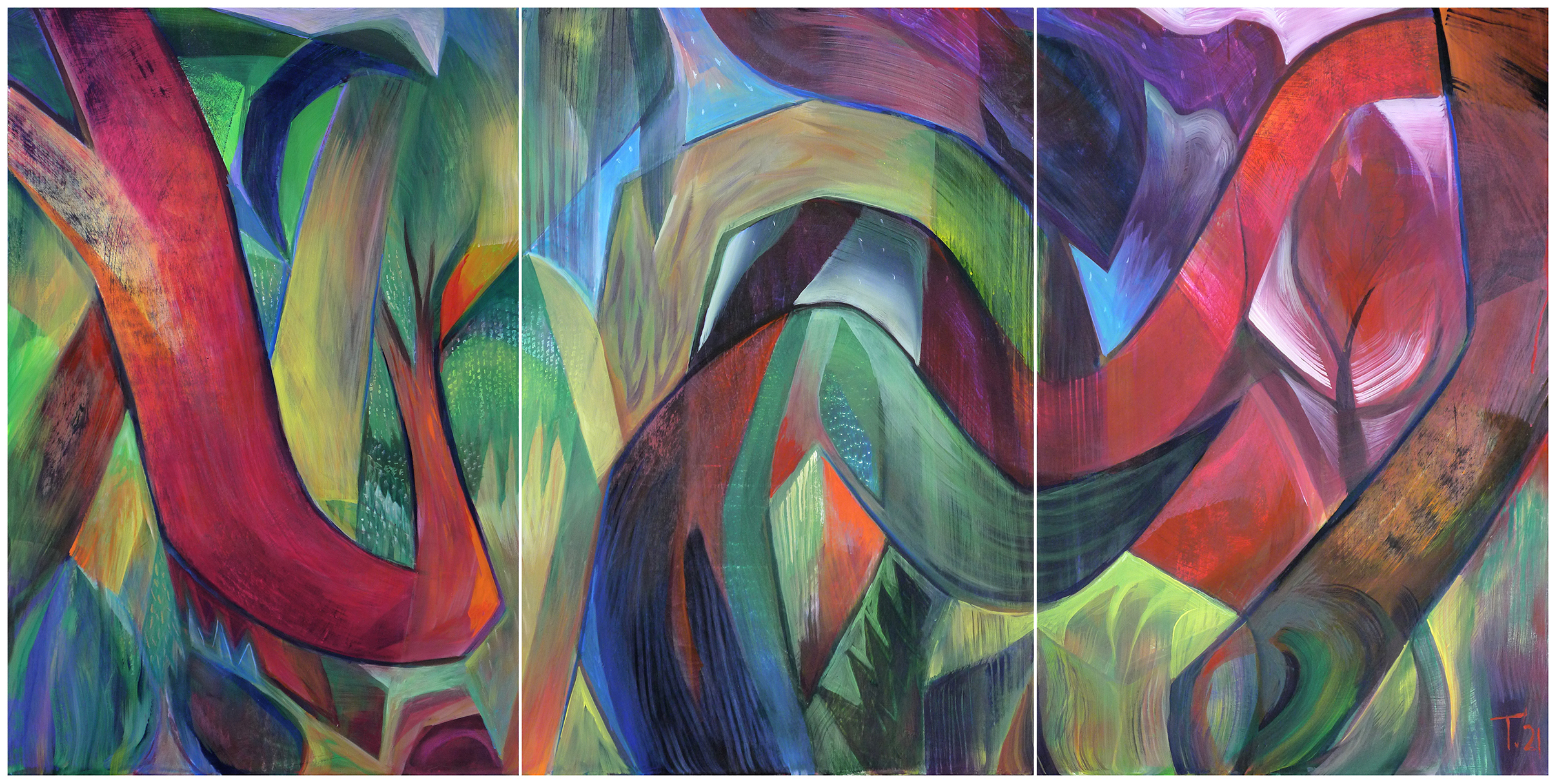Triptych. Flow Acrylic on three cradled wood panels. Satin varnished with UV protection. Edges sealed with black lacquer.