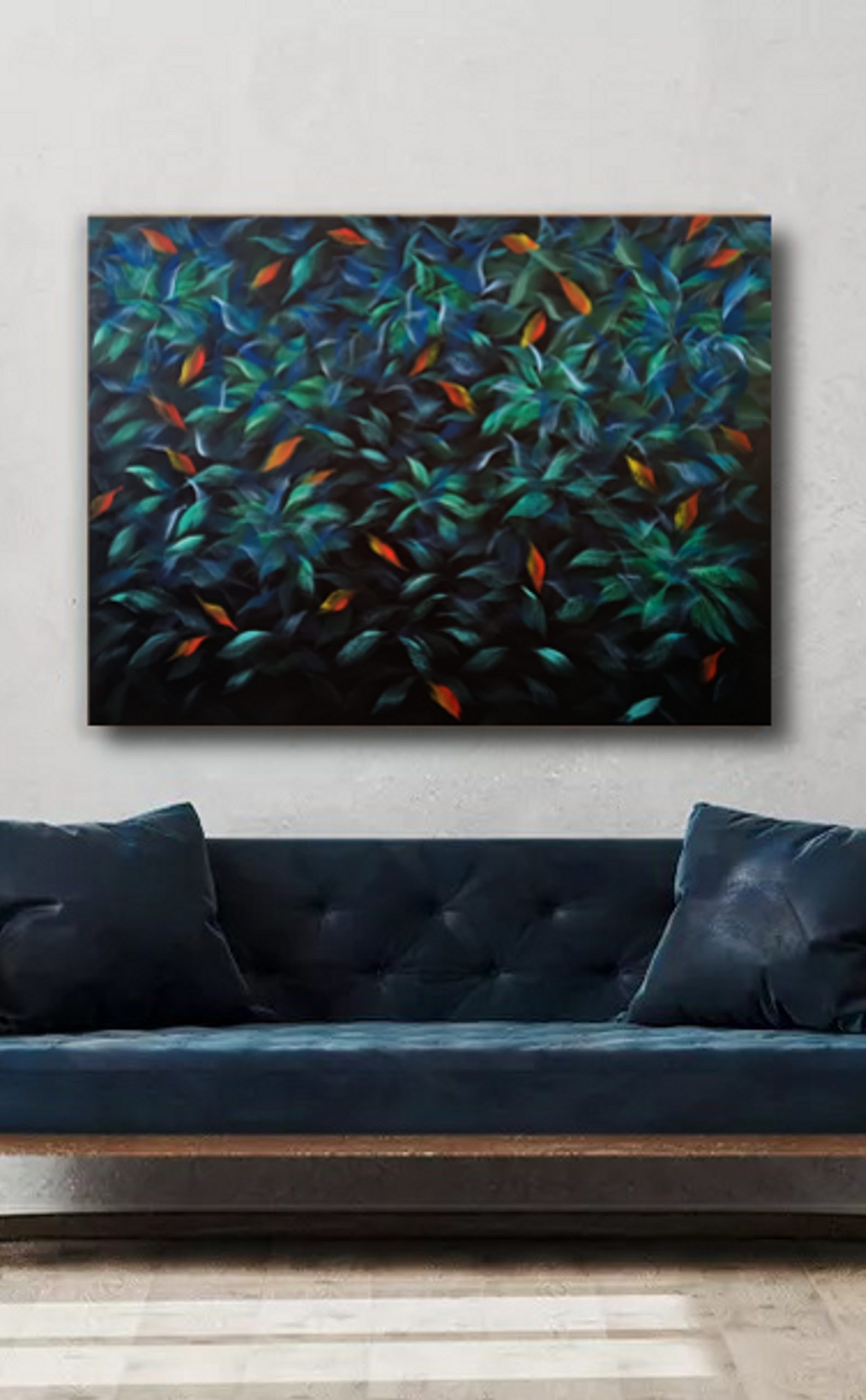 Night Garden by Eva Pearl – Acrylic on gallery canvas stretched and ready to hang. Signed on the back. It has a strong wire at the back. Sides of the painting are painted as a continuation in the same colour to match the artwork so there is no need to frame. Signed with a Certificate of Authenticity.