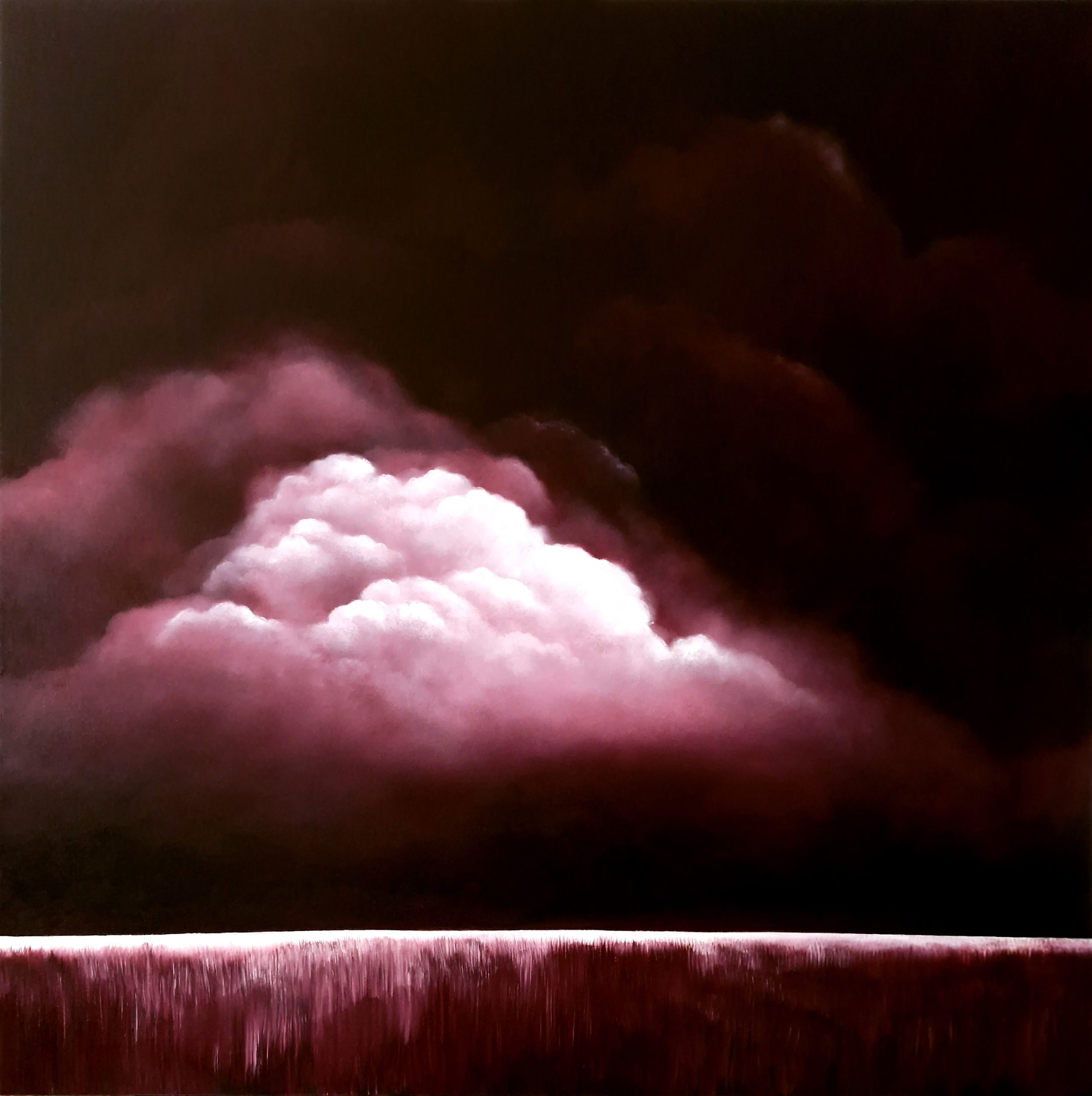 The clouds dominate the scene, floating gracefully in the sky. The clouds and land are rendered in the same maroon through to pink palette, with the addition of high white for the highlights that give them a glowing presence against the muted tones of the land. The white highlights draw the eye to the details in the clouds and their reflections in the landscape.