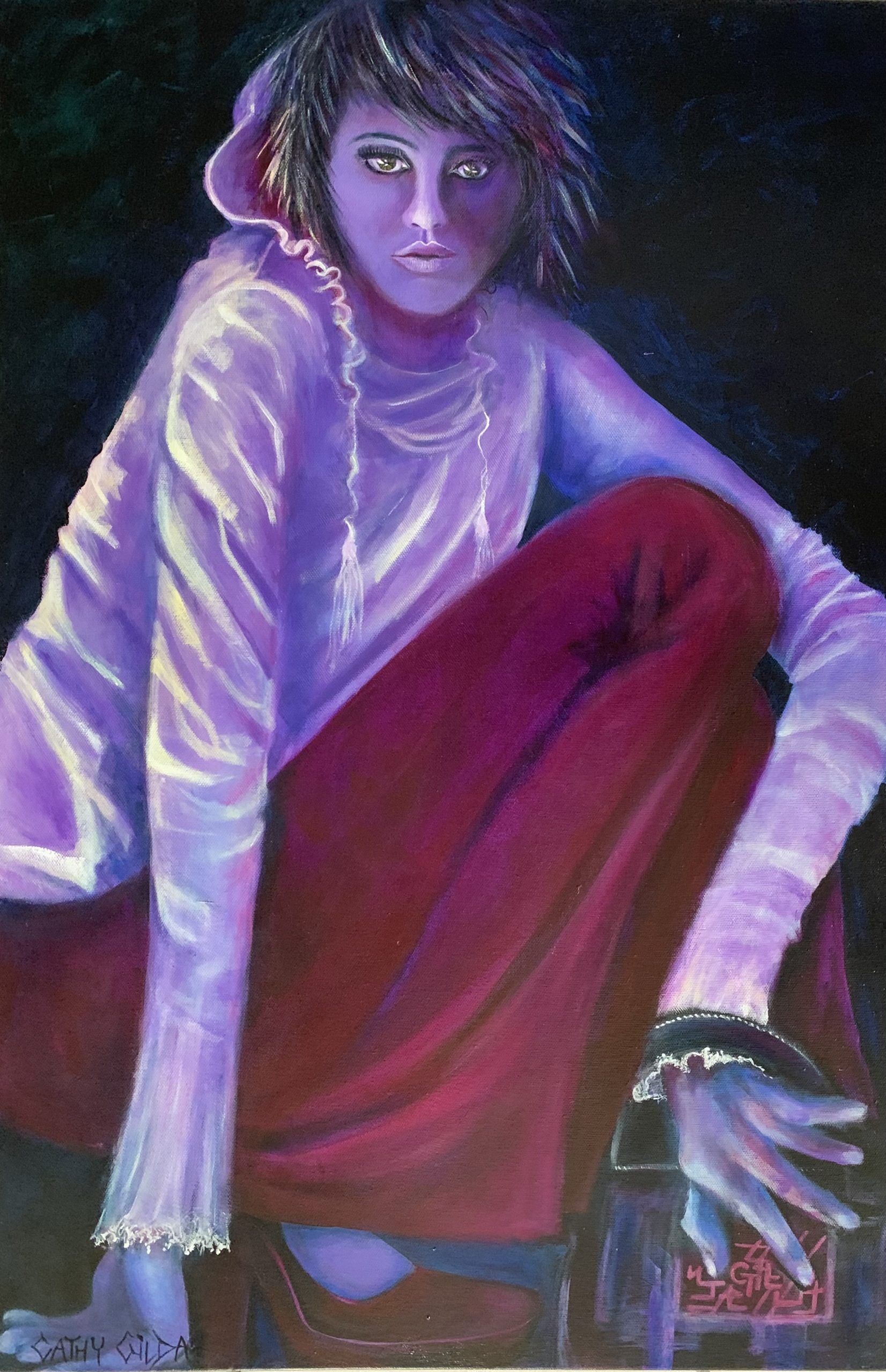 Night Shoot by Cathy Gilday – In this painting, I have tried to capture an image of a fashion model working in night lights. The model is squatting in a typical fashion shoot “Strike a pose,” while staring straight ahead, as if to make eye contact with the viewer. Sides painted and sealed.