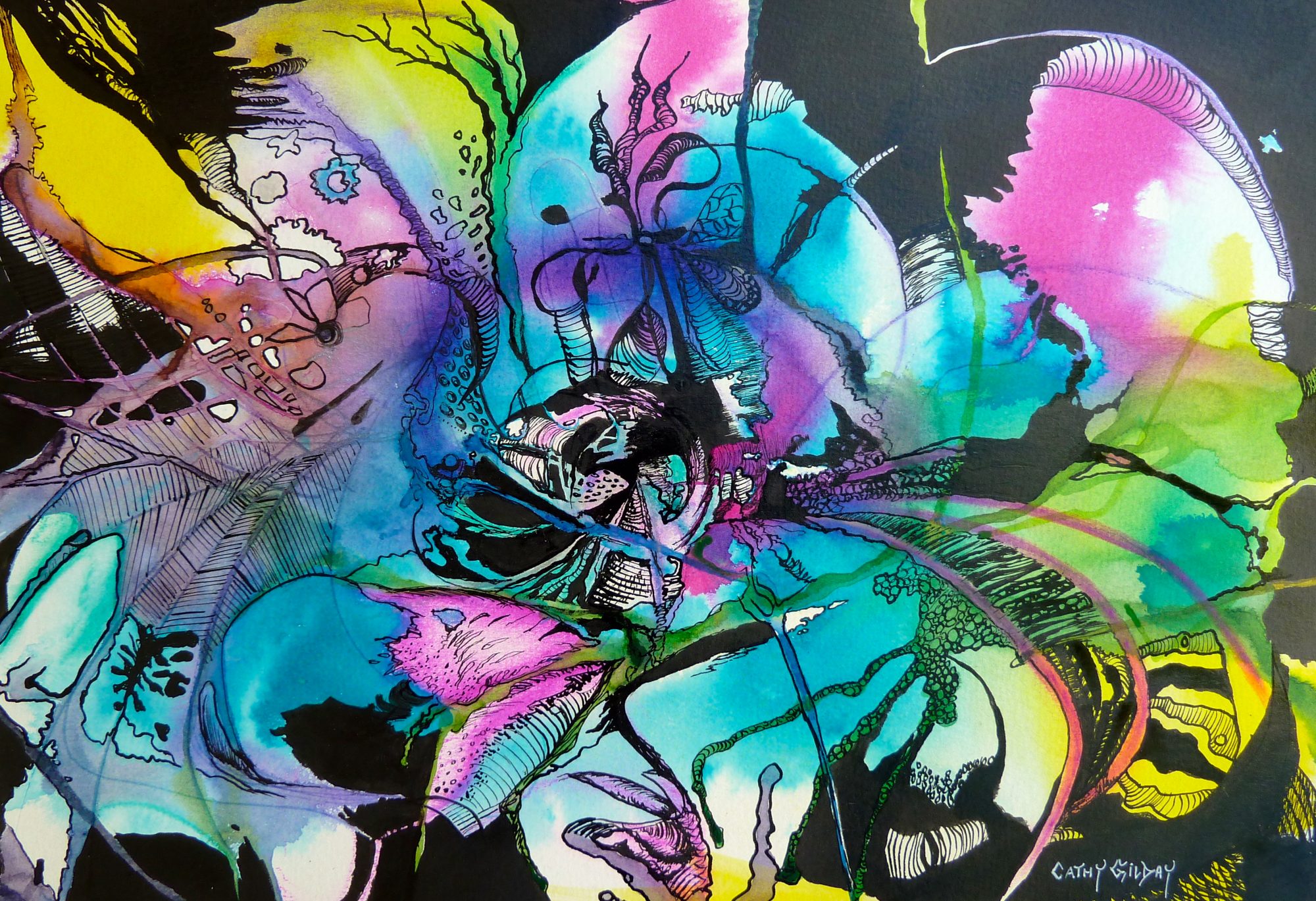 In this abstract ink painting, I have tried to capture the vision of intense colours seen on a night drive. I have drawn in the warped buildings and trees to add the impression of movement. This piece has been framed in a modern black frame with a double mat surround. The overall measurements, including the frame are 39.5 x 51.5 x 4cm.