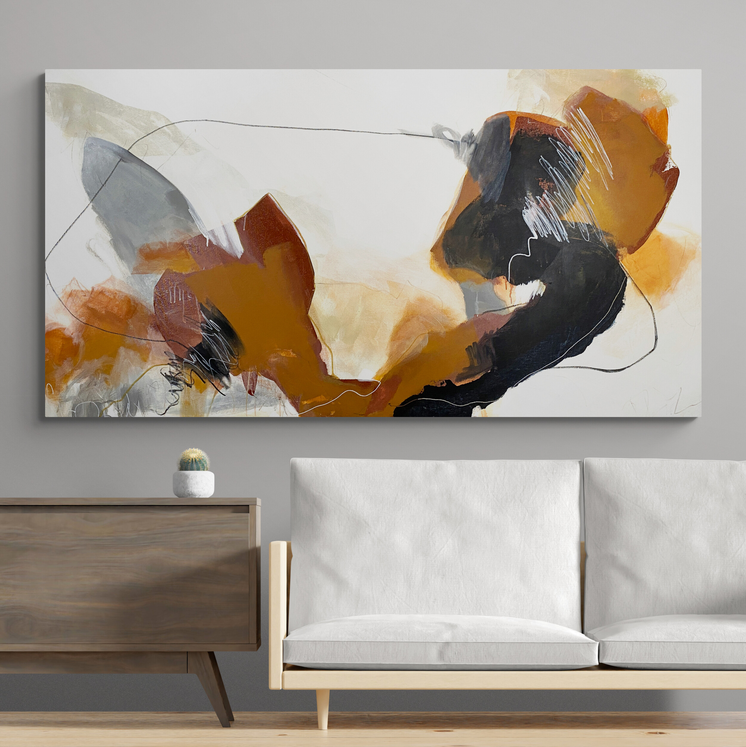 Perfect for any large space, its vibrant palette of light warm beige and browns, grey, bluey black and white makes the bold mark-making in this piece come alive.