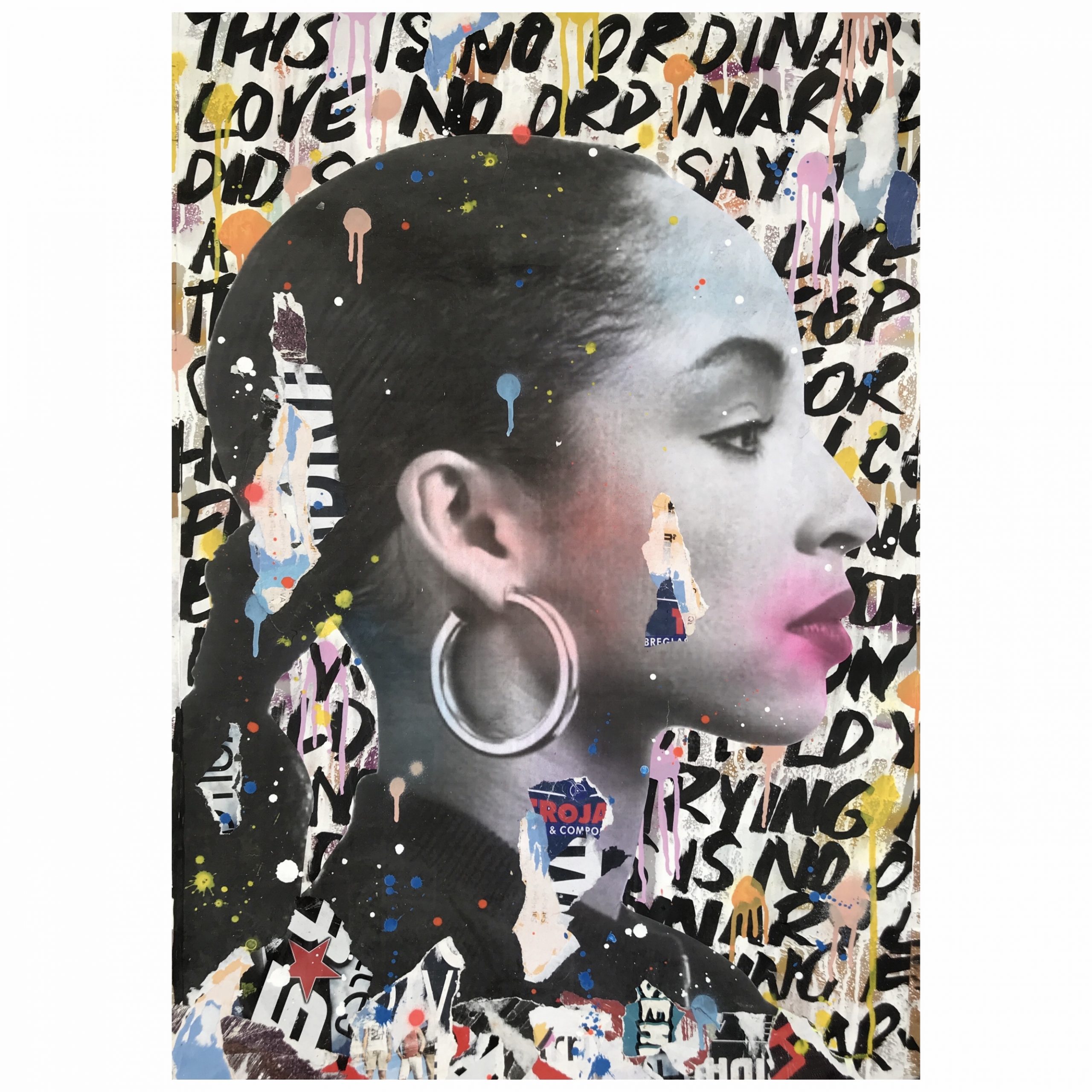 The main vintage image of singer Sade was added and overlaid with a paper and paint
