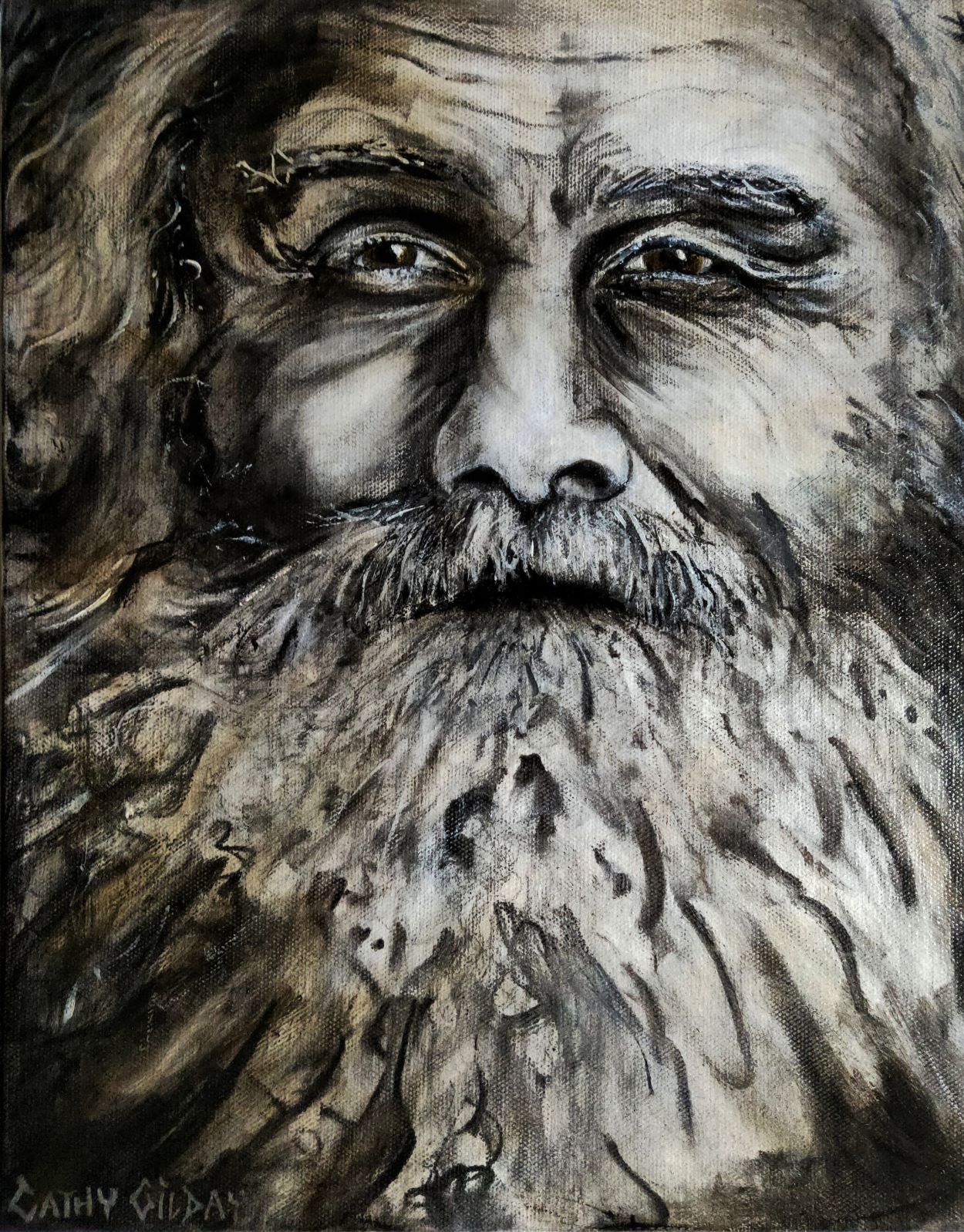 No Regrets by Cathy Gilday – In this portrait, have chosen to paint an older face as I think it shows so much wisdom and character. The grey wiry beard‚ exaggerated features and heavy wrinkled skin, make you want to know more about the lifetime of stories those eyes have seen. I hope, that at this point in his life, he has no regrets. Acrylic paint, charcoal and watercolour pencil, sealed.