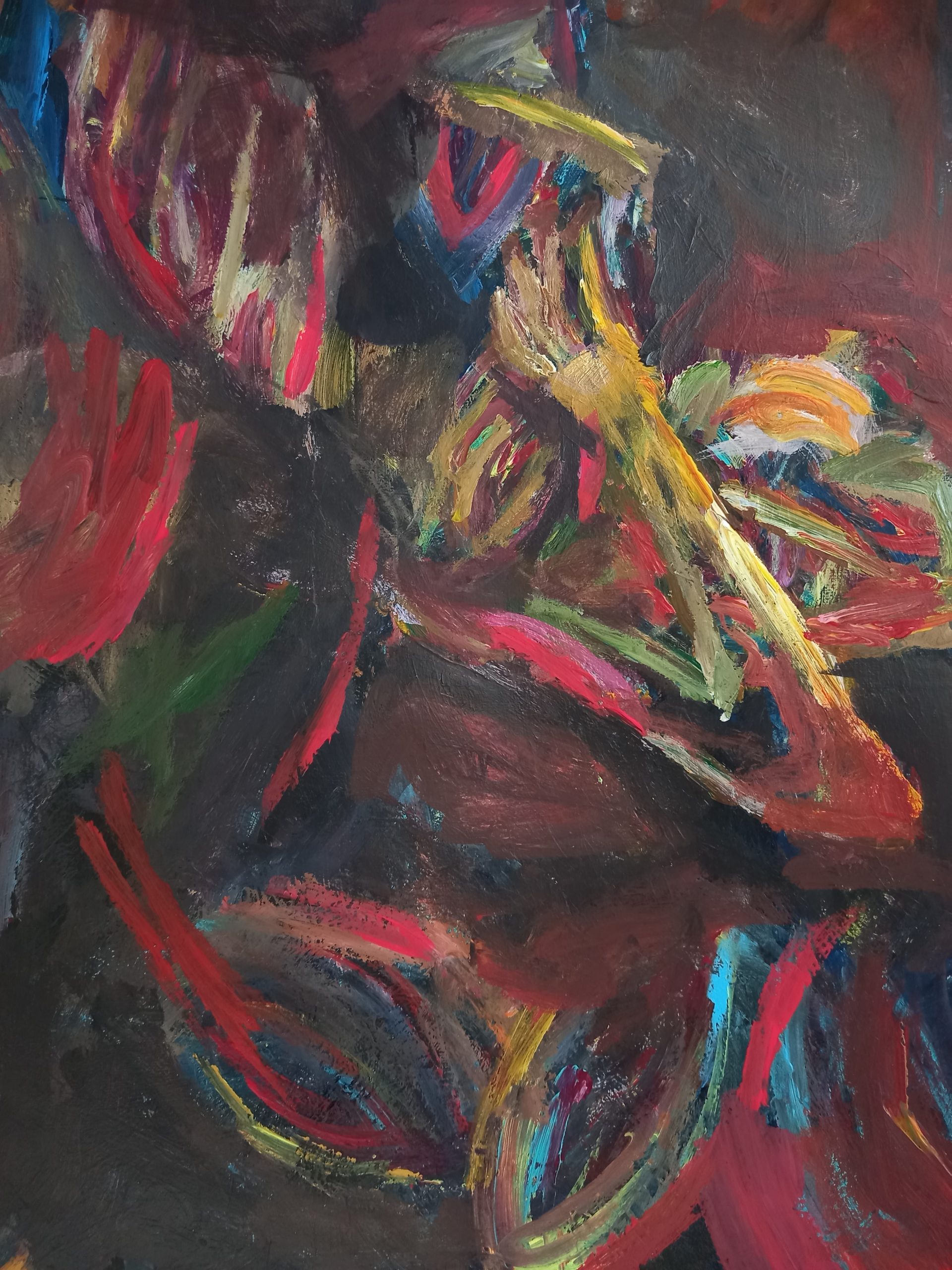 Nocturnal Dreams by Helen Andrade – Dreamlike, surreal and mysterious; an arm and hand and ambiguous objects appear mysteriously, coming out of the the dark in an expressive atmospheric manner. This piece is influenced both by expressionist artists and surrealist artists such as Salvador Dali and Australian surrealist James Gleason whose work expressed the subconscious and its language of the irrational. It is beautifully coloured.