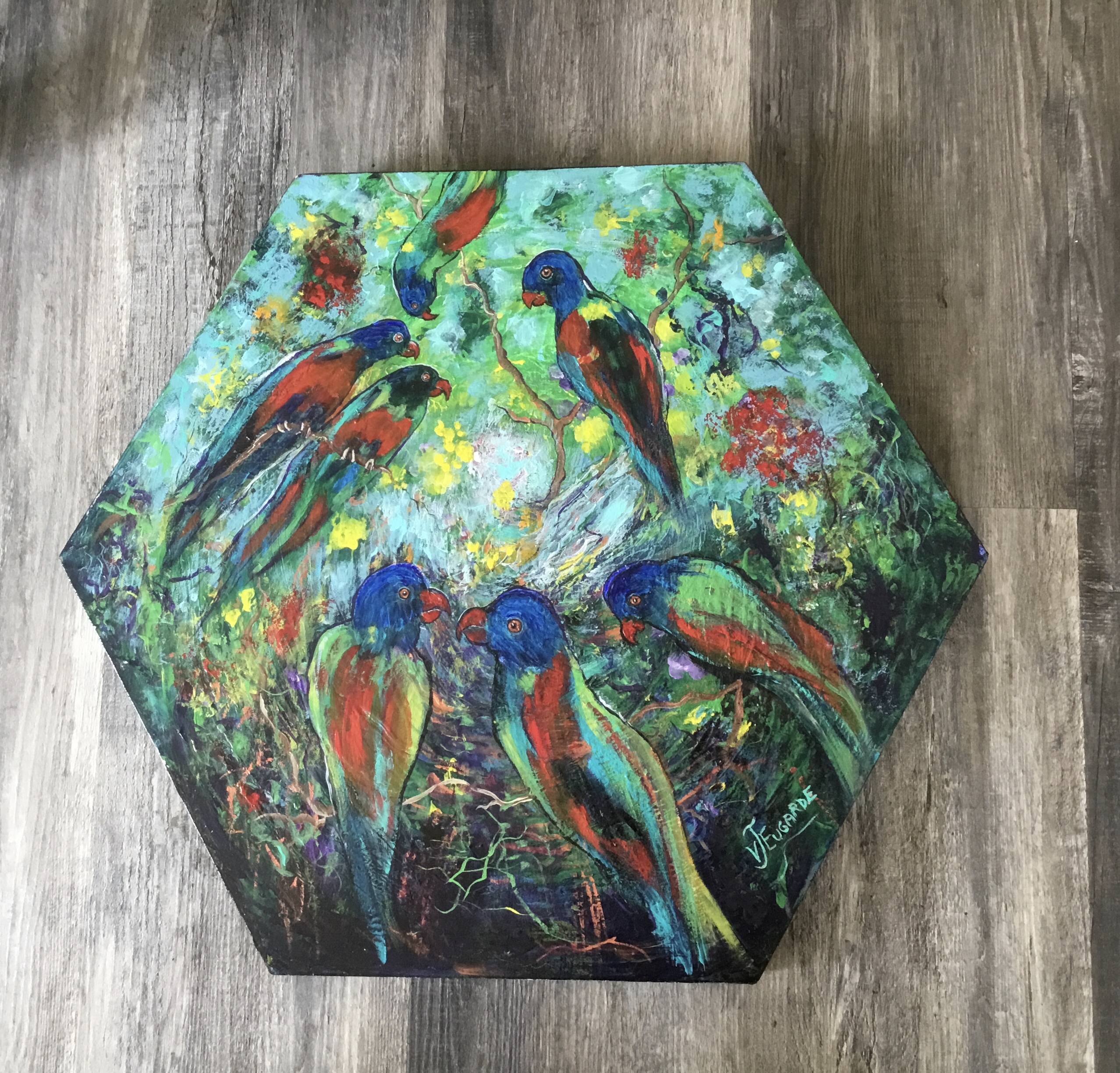 Noisy Nosy Neigbours is all about the conversations and gossip that I’m sure goes on in the lives of parrots and all birds, these rainbow lorikeets are just involved in a little get together. I love nature and colour so these birds are the ideal subject to liven up the colour palette, they are sitting amongst the trees and gum blossoms just enjoying a lazy Sunday afternoon.