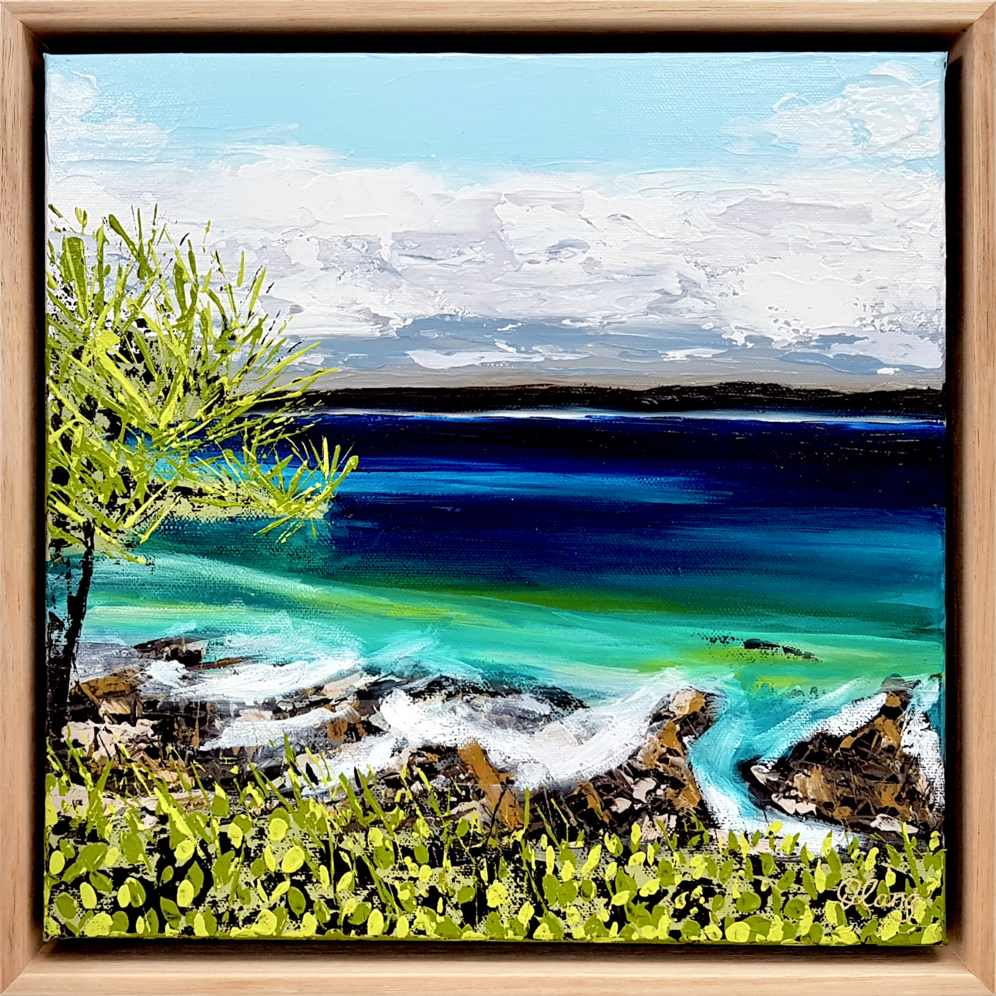 Hand painted on stretched canvas impasto style with a beautiful blue and green palette which pops against the rocky shoreline inspired by Boiling Pot lookout on the Noosa National Park coastal track, Queensland.