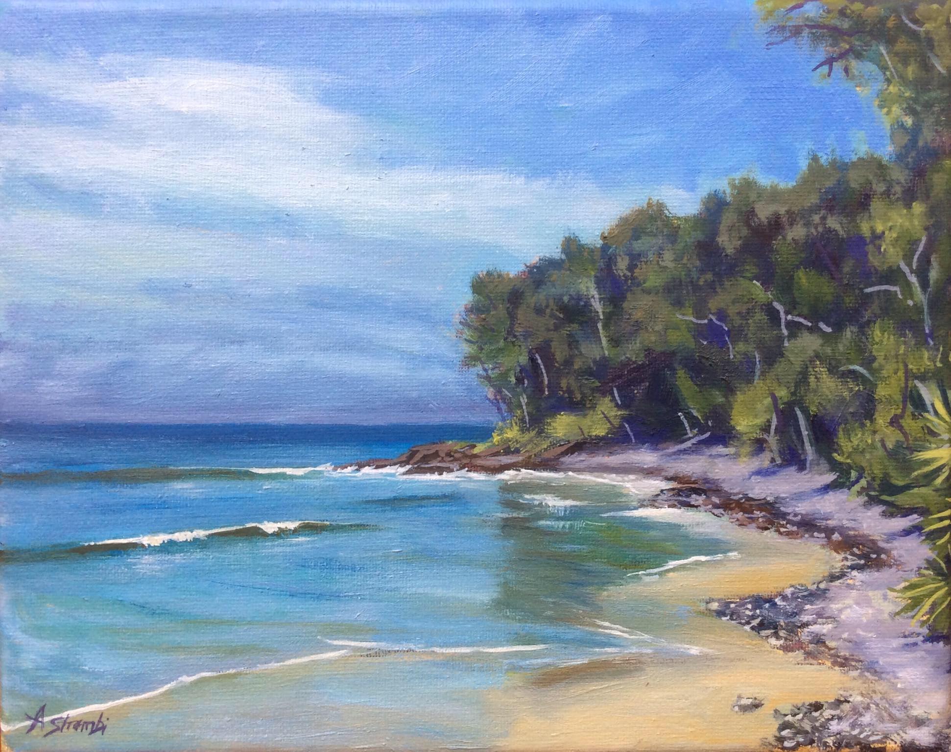 This little oil painting was inspired by Little Cove at Noosa, which is a lovely quiet bay with gentle waves and surrounded by pandanus palms and other foliage. The painting is ready to hang with a cord on the back but would also look good with a frame.