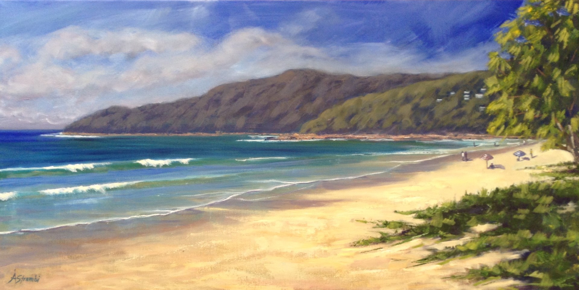 This original oil painting is based on previous holidays and day trips to Noosa in Queensland. This is the far end of the main beach. I used photos for reference to remind me of those relaxing days at the beach. This painting reflects those memories of the headland and beach on a sunny day. In the distance there are a few figures and umbrellas to give it that holiday mood! The sides are painted to match the painting and it is ready to hang.