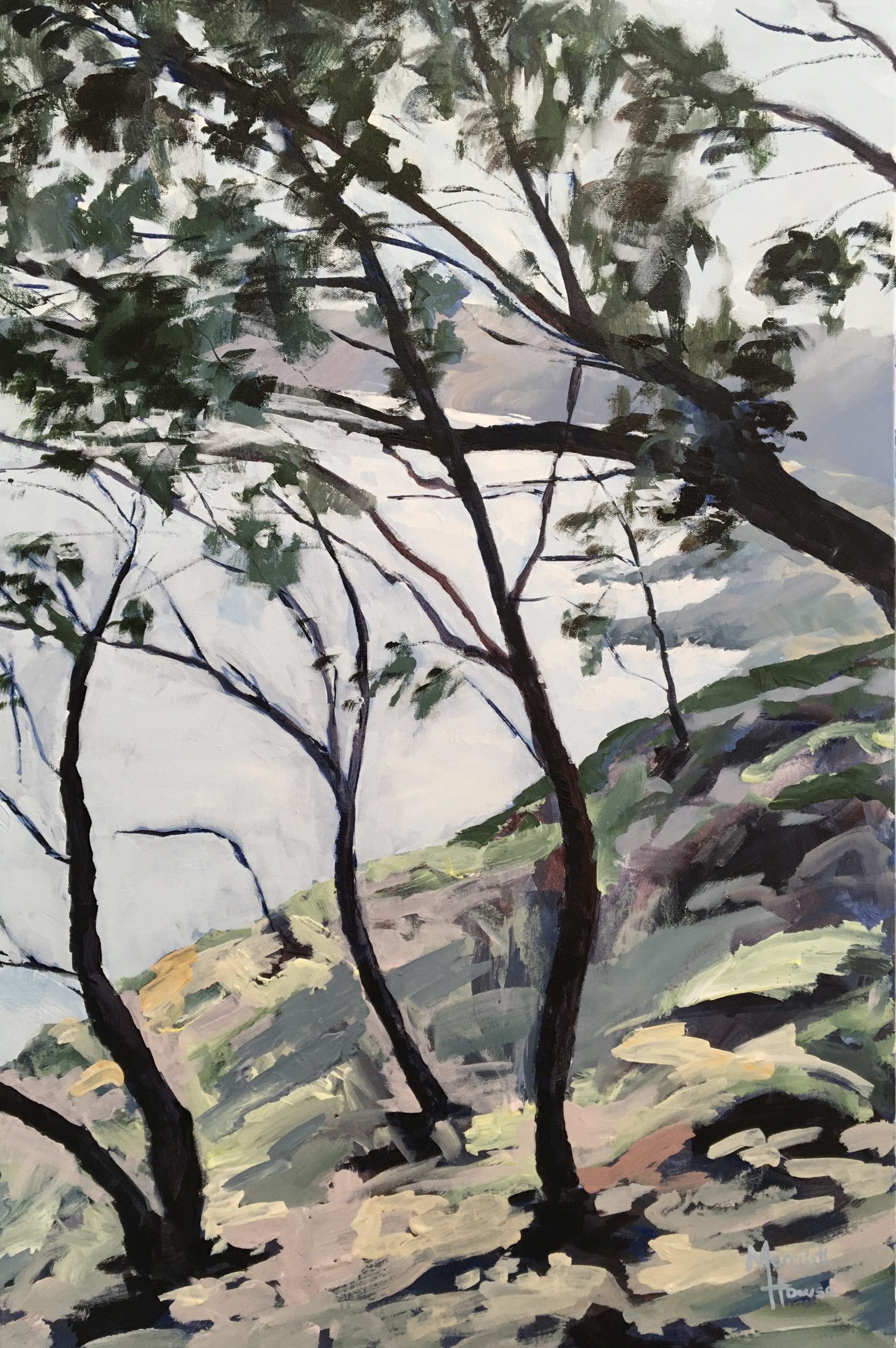 This artwork has beautiful dark tree branches with blues, greens and greys.