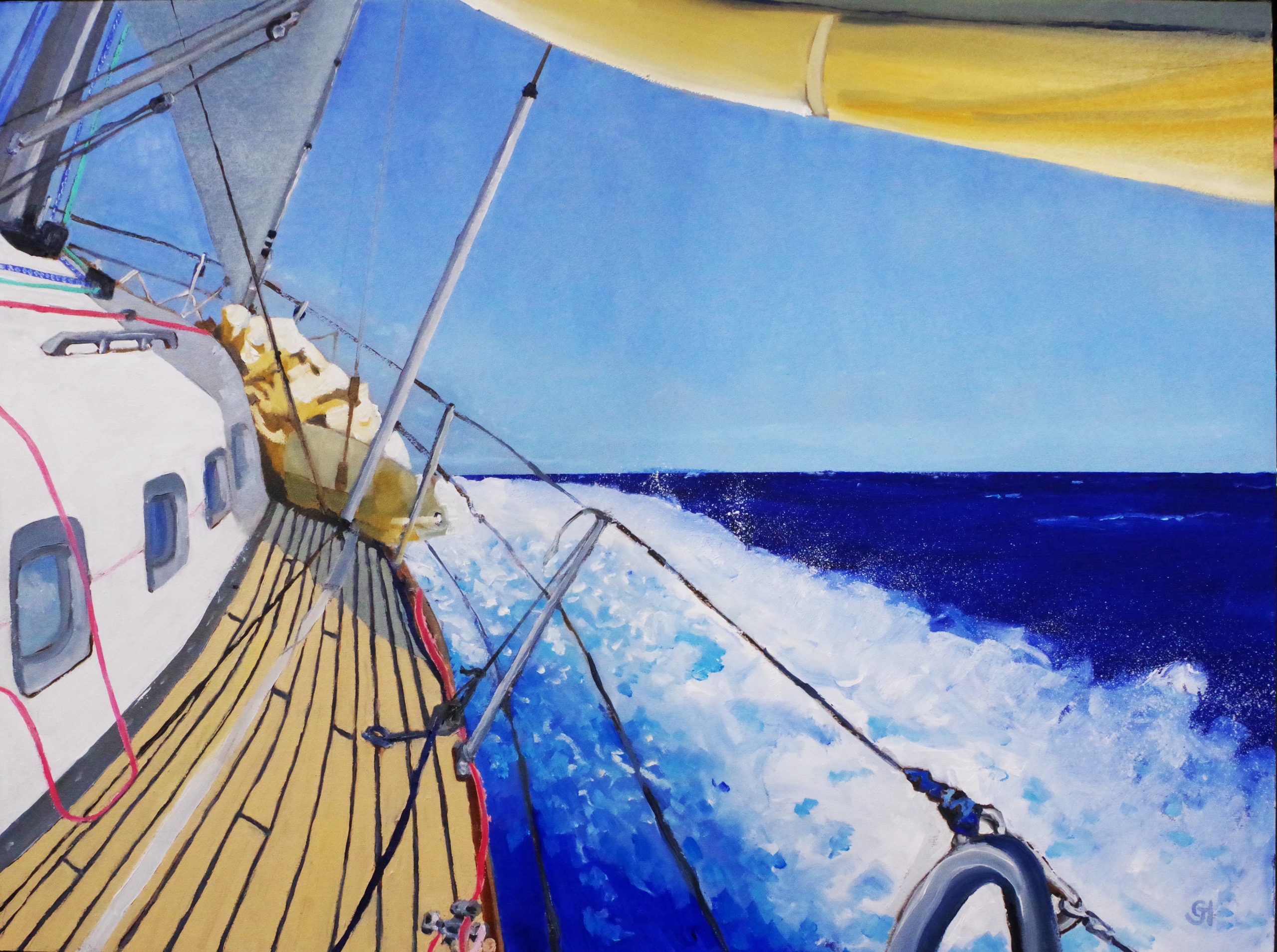 During the winter months many yachts make the journey north to warmer climes, sharing the Whales highway as the make their way from the Antarctica to the breeding grounds. Unframed, sides painted black, wire across the back, ready to hang.