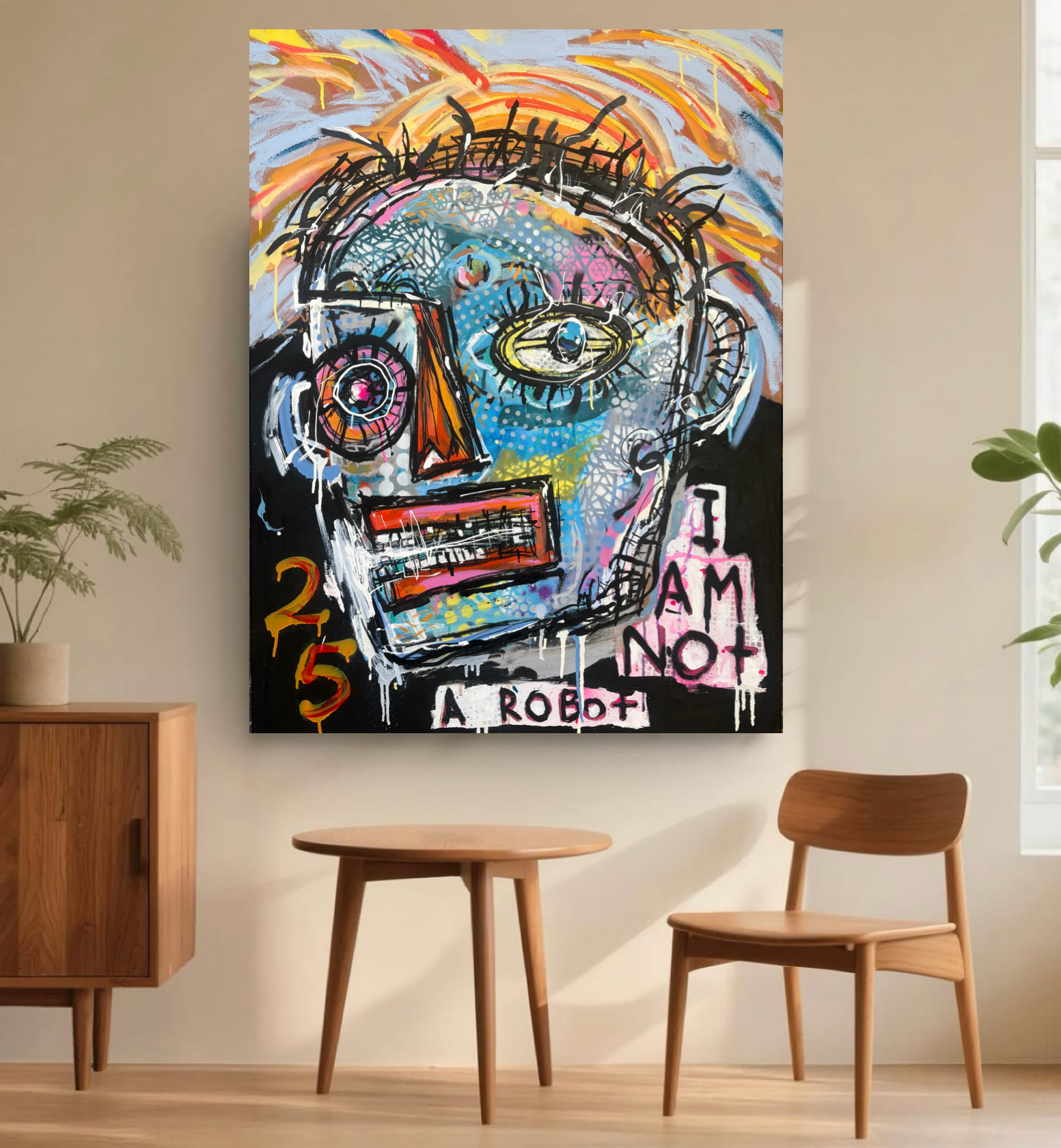 Al – ‘ColdGhosts contemporary mixed media artworks explore the evolving relationship between humanity, technology, and consciousness. Fusing visual storytelling with traditional paint techniques GhostArt creates thought-provoking artwork centered around robots and artificial intelligence. His pieces often reflect on the blurred boundaries between the organic and the synthetic, examining how Al mirrors, disrupts, or even redefines what it is to be human’ ..