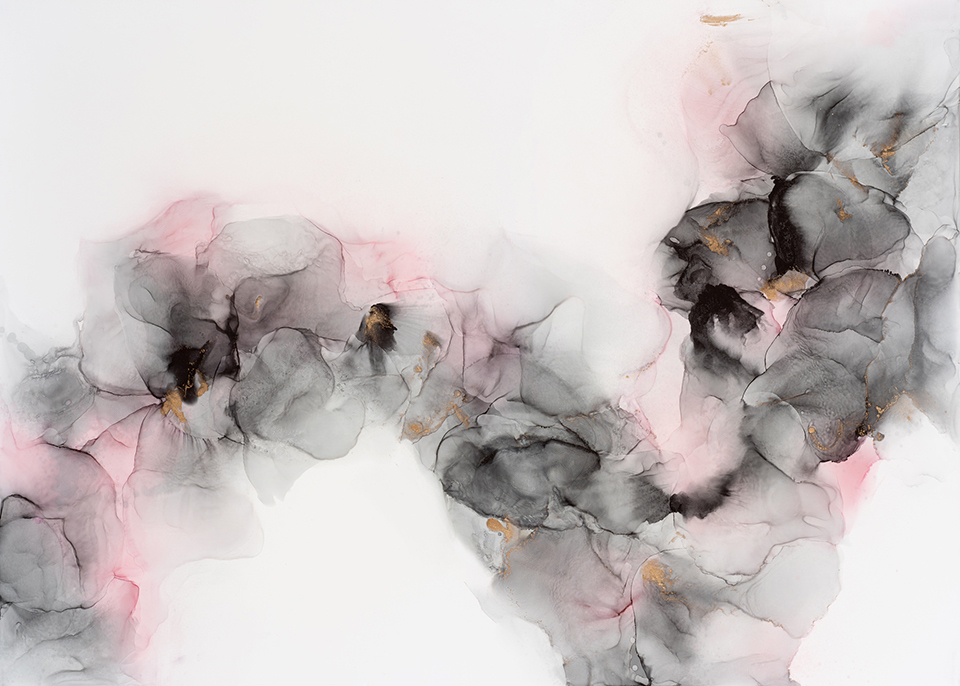 An unframed original artwork created with pinks, black and metallic brassy gold.