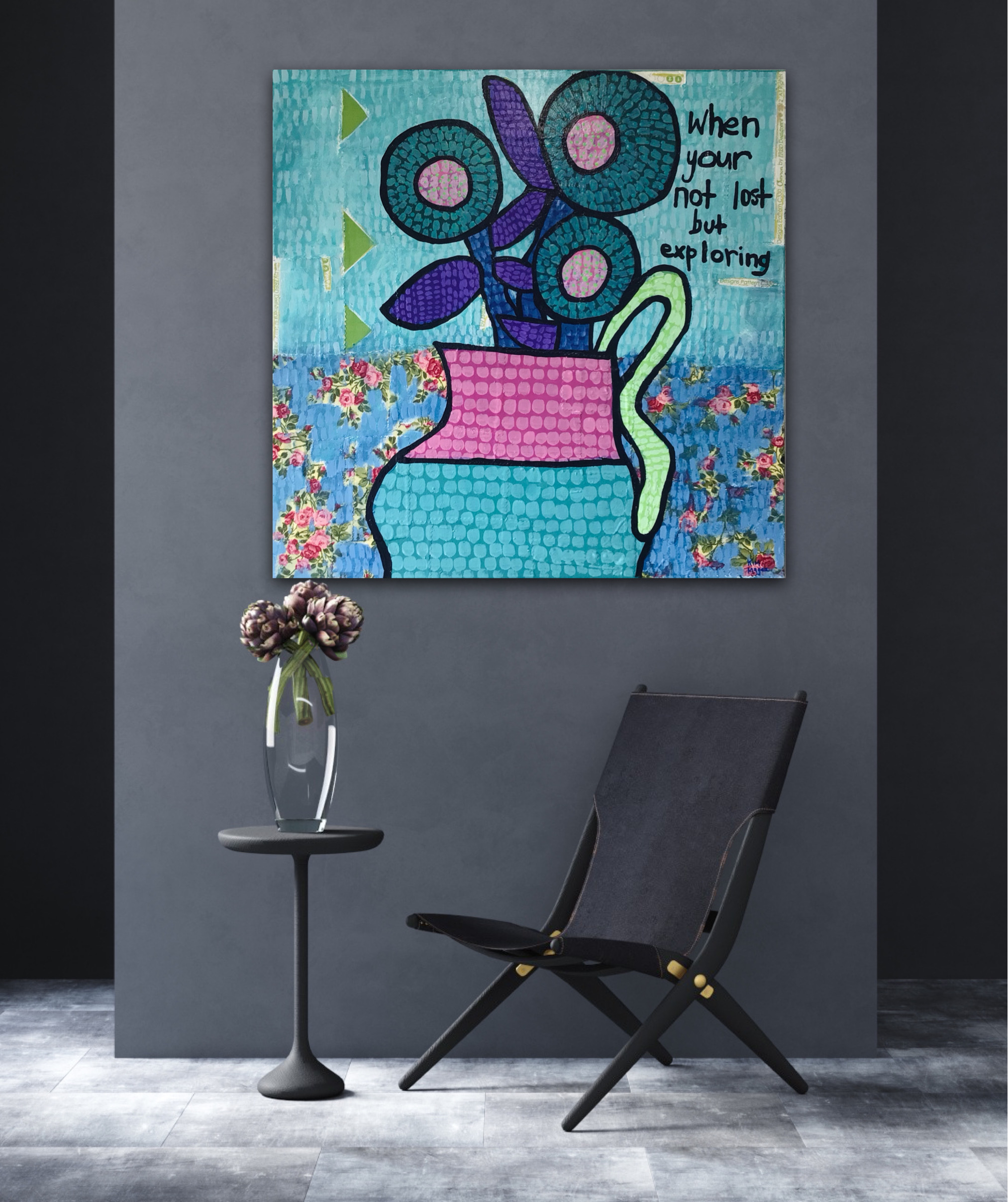 In the captivating artwork “When You’re Not Lost but Exploring,” Kim invites viewers into a vibrant tapestry of mixed media elements on a 60 x 60 cm canvas. This piece intricately weaves together layers of fabric, acrylic paint, and a thoughtful travel quote, creating a rich narrative that celebrates the spirit of adventure and discovery.