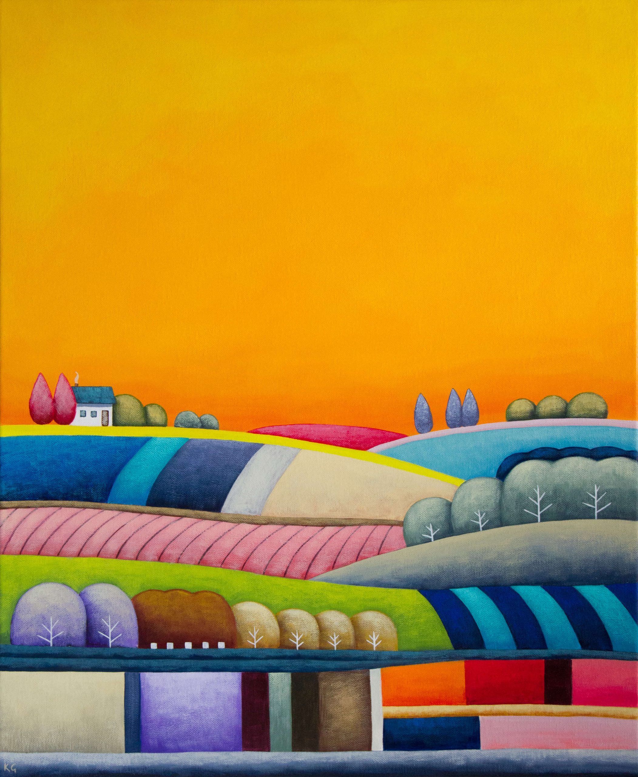 This portrait-shaped painting has a soaring yellow sky with fields of pink, blue and green below, a house sits on the horizon. The style is semi-abstract and has a whimsical and cheerful vibe. This piece would make a striking addition to an art collection and would add a warm vibe to a living room, bedroom or office. Sides are painted in a continuance of the composition so no need to frame.