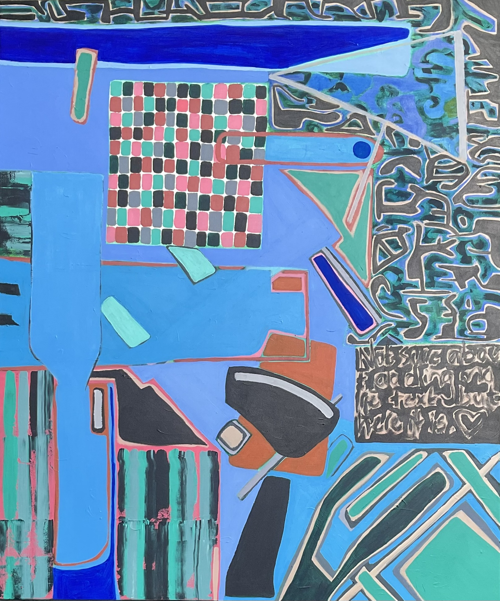 Not Sure About Adding More Text but Here It Is by Kathy Best– This geometric abstract piece begun with text, more text was added in a small area part way through (hence the title) and the process ended with ultramarine blue.