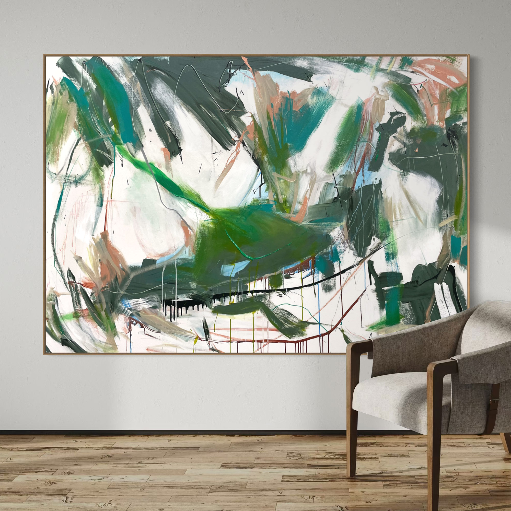 This stunning piece combines complex mark making and texture in acrylic paint and pencil with a beautifully balanced palette of white mixed with areas of light green, olive, dark green, grey and coral with pops of beige, blue, lemon and terracotta.