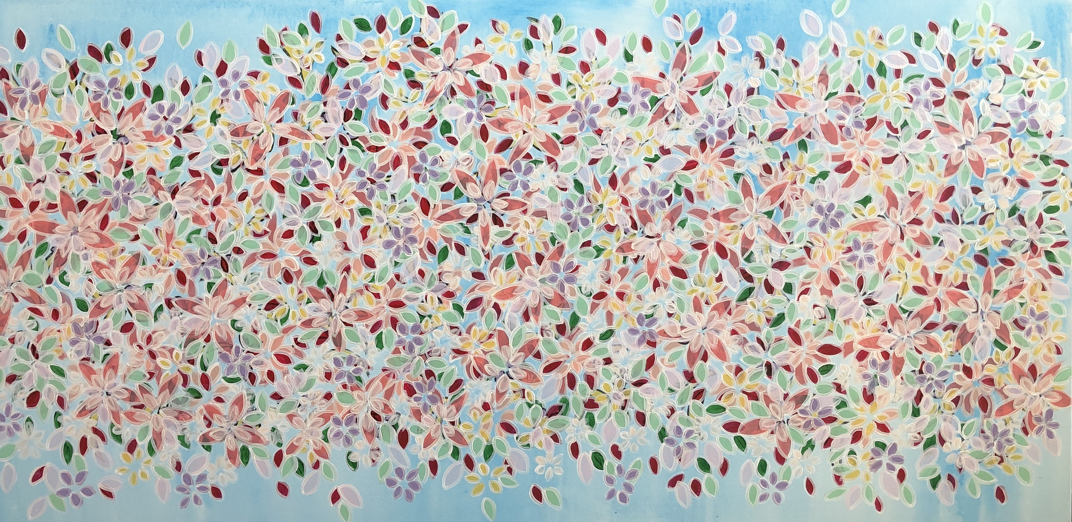 This painting is fresh and happy. Soft colours. Layers of colour painted onto the canvas. Each colour applied with a brush and when dry the shape is outlined with white acrylic. Look at the close up photos and you will see the detailed work. Lots of colours and flowers. So beautiful.
