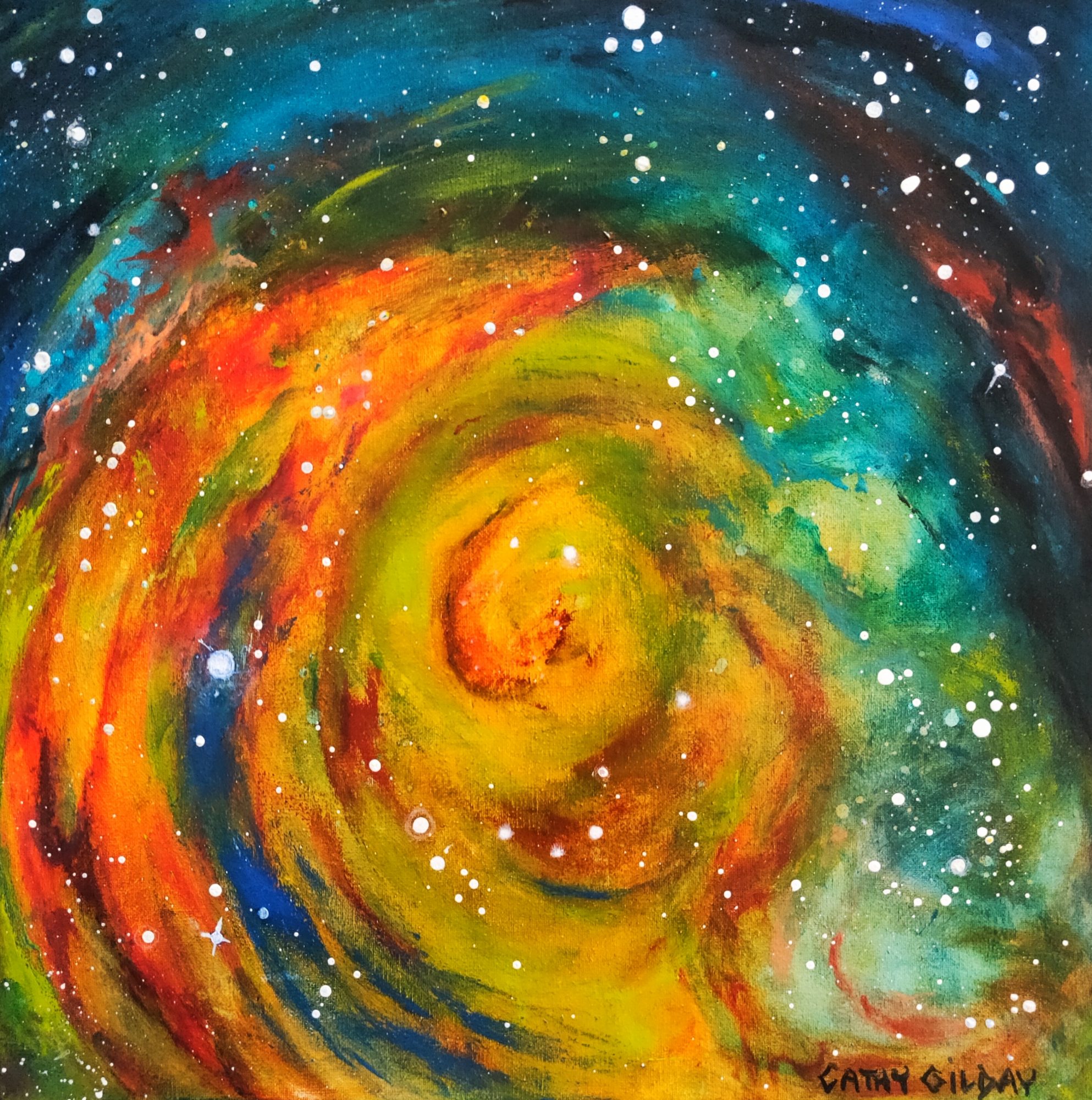 Nova by Cathy Gilday – For a smaller piece, this abstract realism painting really packs a punch with it’s wonderfully vibrant colours. The third of a new series titled ‘Seeing stars,’ where I am exploring the universe on canvas. While painting this piece, I enjoyed using coloured glazes to create the star formations. Sides painted, sealed and ready to hang.