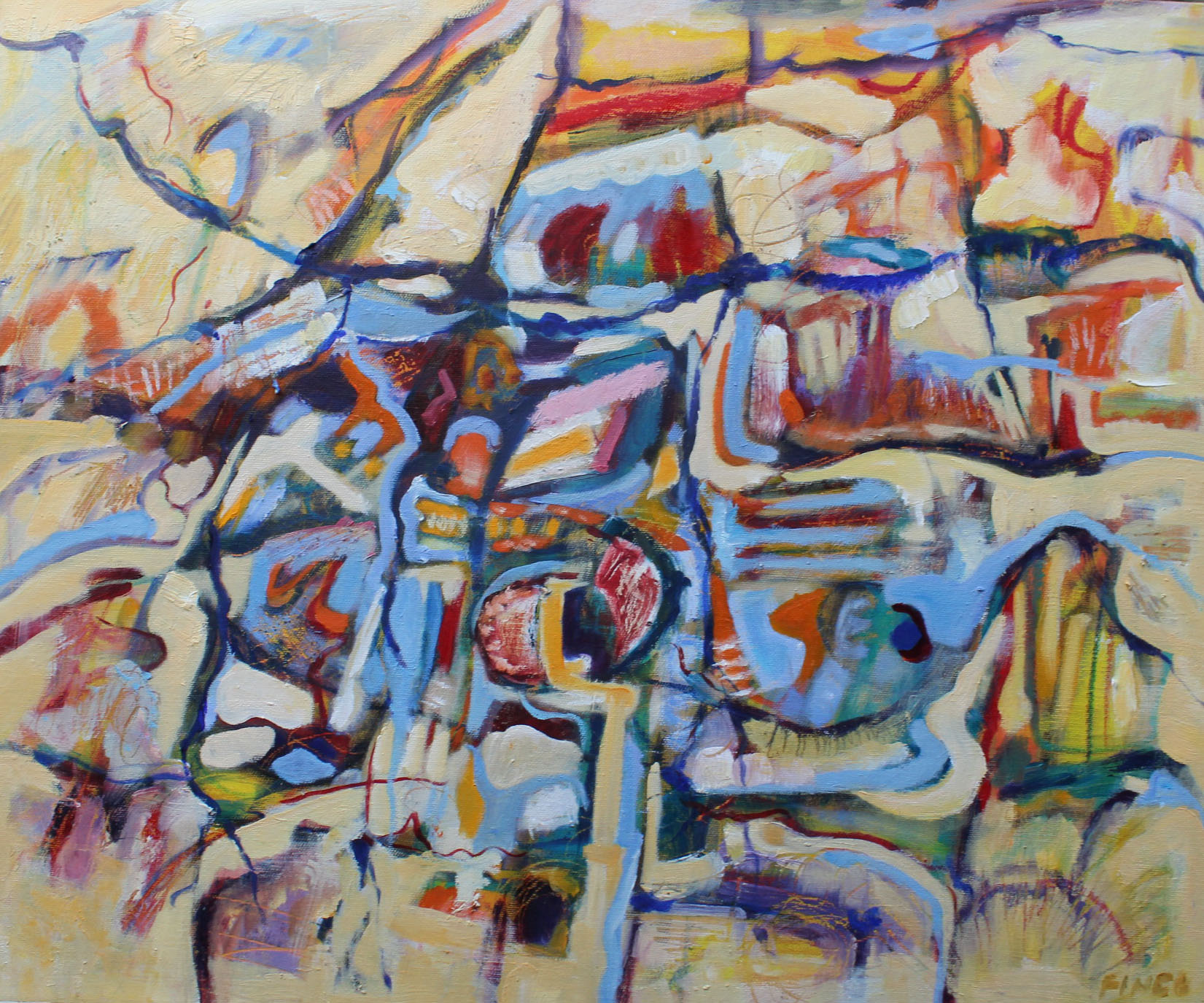 The canvas was sitting around with a few bits of paint on it from some time ago. I used these few lines to build up an abstract painting.