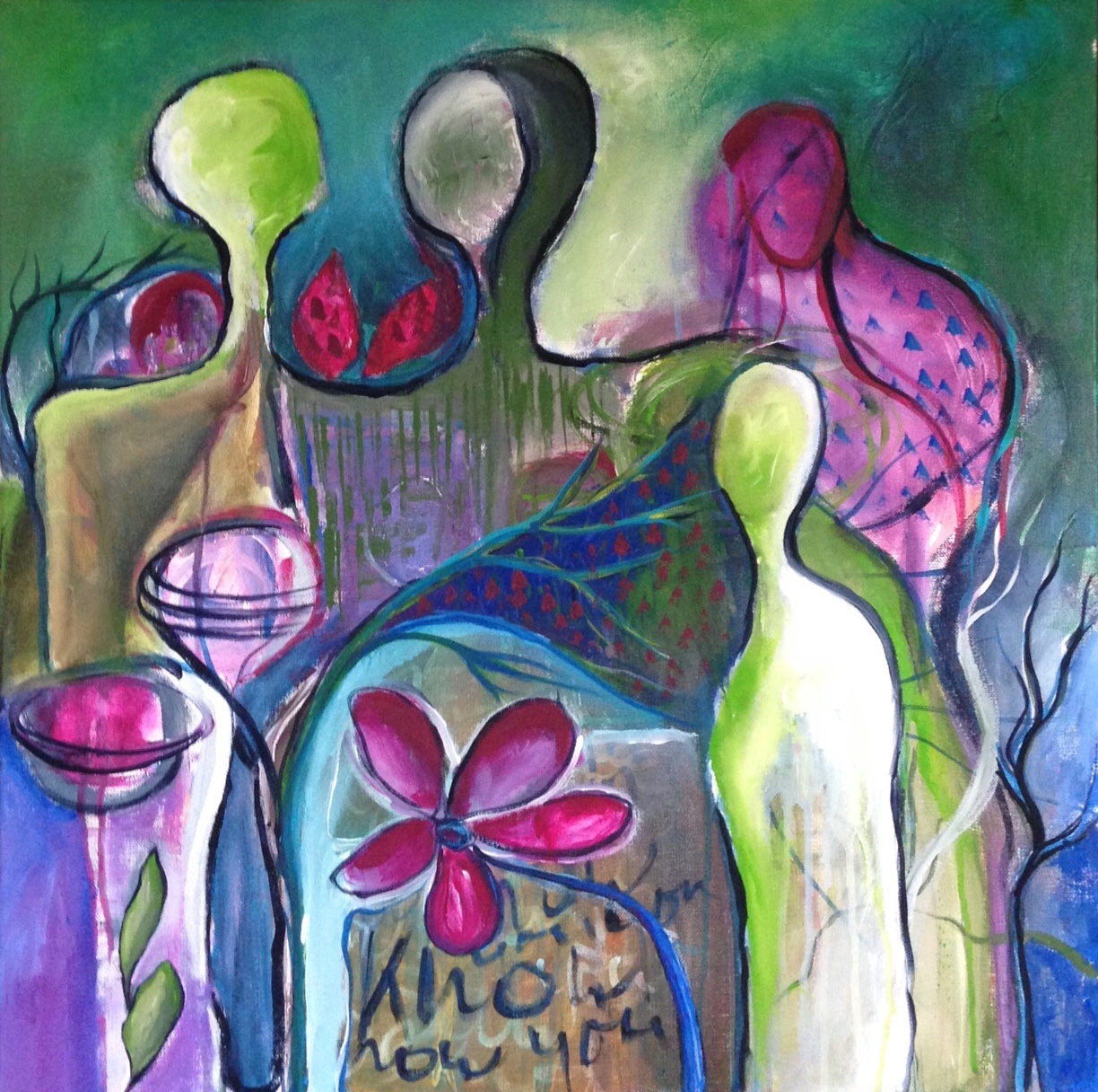 This painting was influenced by the music I was listening to and which inspired me to dance and feel free and pick up my brush then let the paint freely flow on the canvas. From there I started layering, brought text and texture into the work thinking about people and the world we live in and brought it all together in a harmonious colorful piece of work.