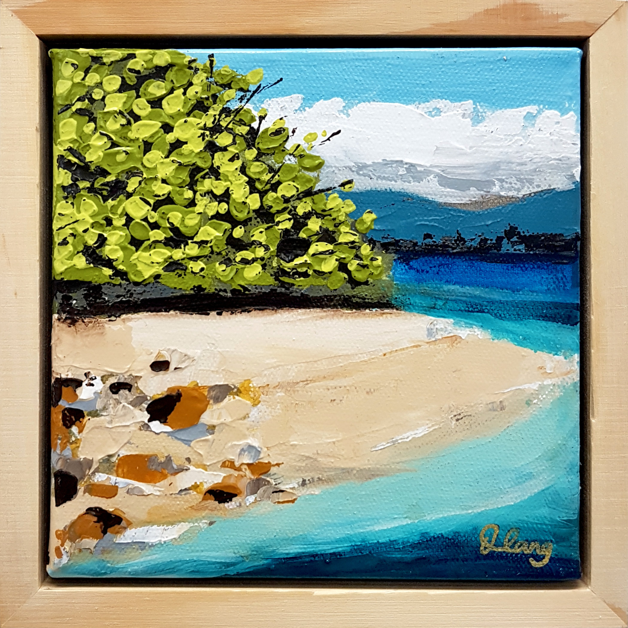Hand painted on stretched canvas impasto style with a beautiful blue and green palette which pops against the soft sandy shore inspired by Nudey Beach, Fitzroy Island, Far North Tropical Queensland.