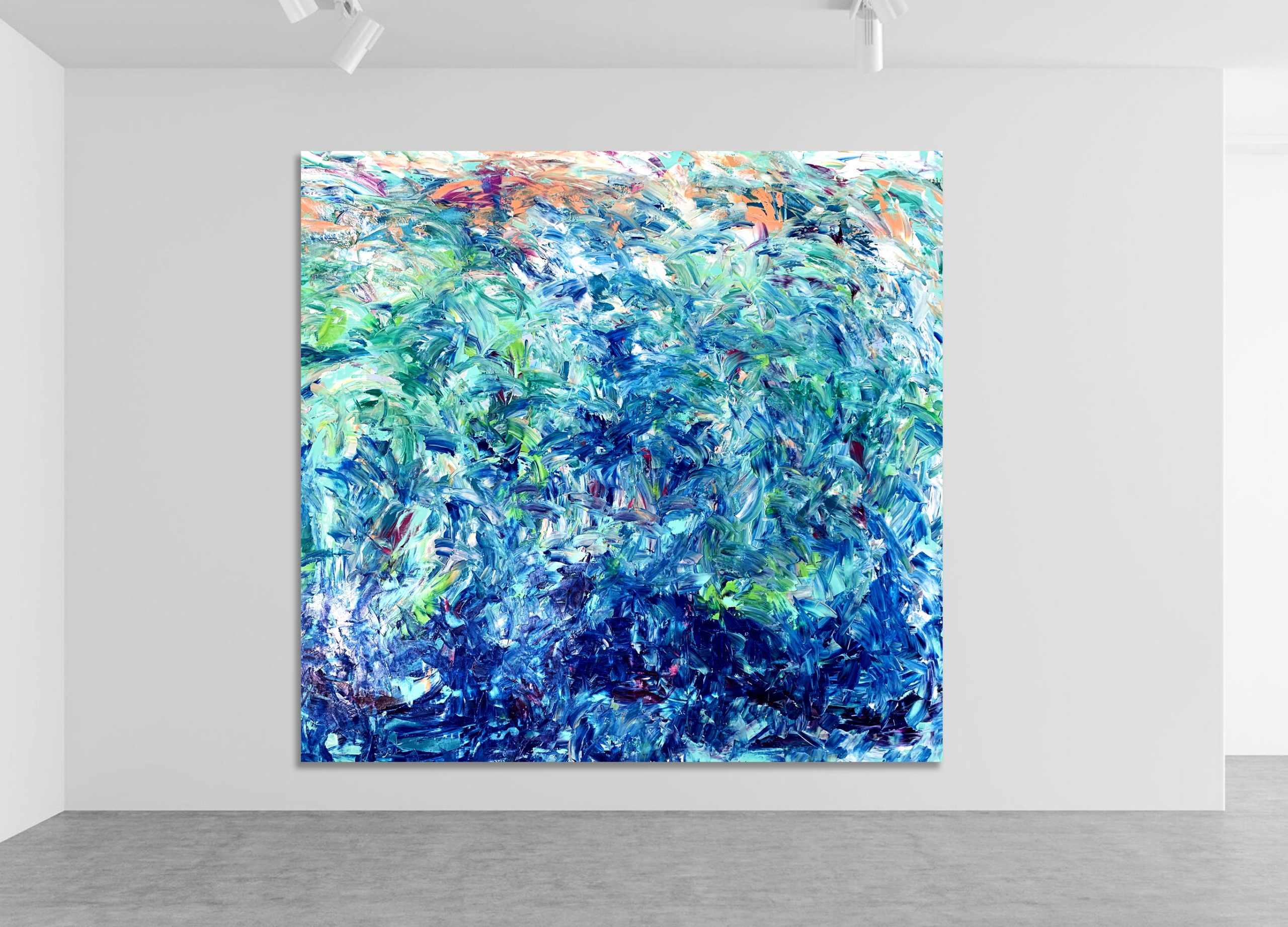 This work is painted with synthetic polymer acrylic and the surface is a professional-grade 12 oz canvas and has been sealed with varnish. Thew canvas is stretched onto an HD stretcher with dimensions 200 cm height by 210 cm in width. The artwork has been painted white on the sides and so does not need framing.