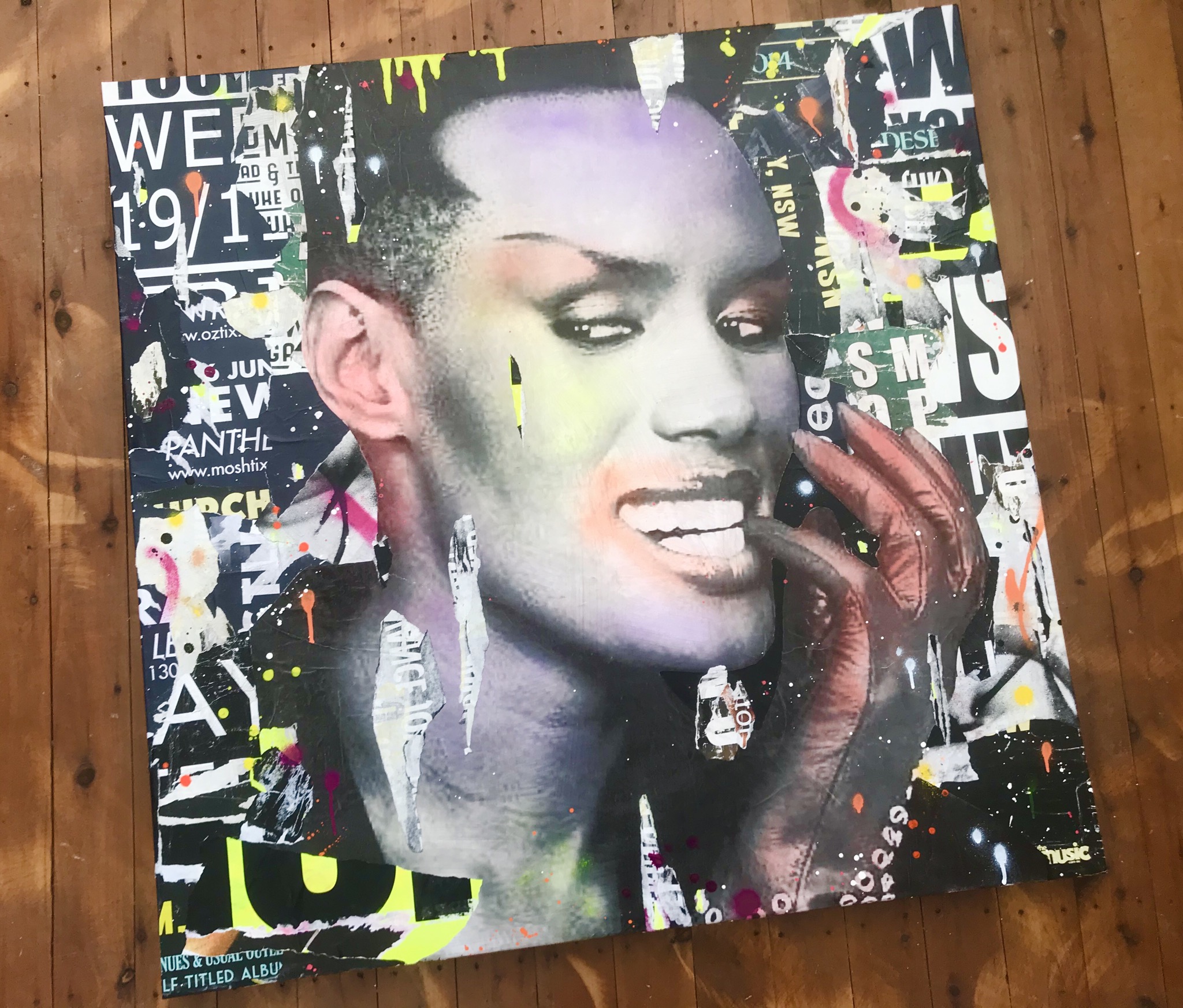 The main collage was built up with posters collected off the streets of Sydney, Melbourne and Newcastle. This background was then overlayed with Acrylic Paint, Sugar Spray Packs. Then the main Image of a 80’s Icon Grace Jones, was added and further overlaid with paper & paint to give the work a worn rustic appearance.