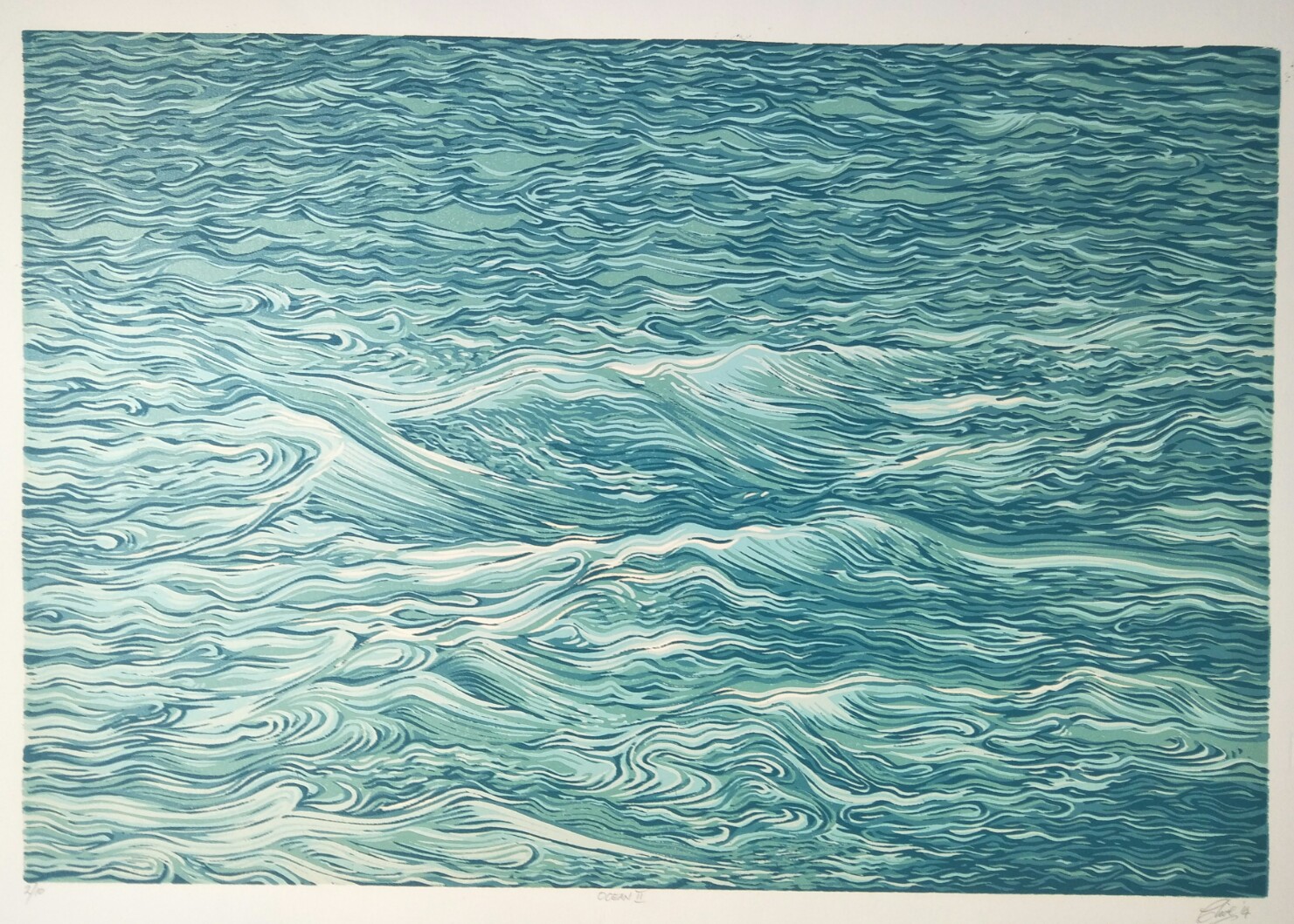 Ocean by Clive Dickson – Limited edition (10) lino print on paper. The ocean is a subject that I enjoy working with as it works both as abstraction and figuration. Much of my abstract output is concerned with the dynamic flow of energy, the ocean becomes an obvious reference.