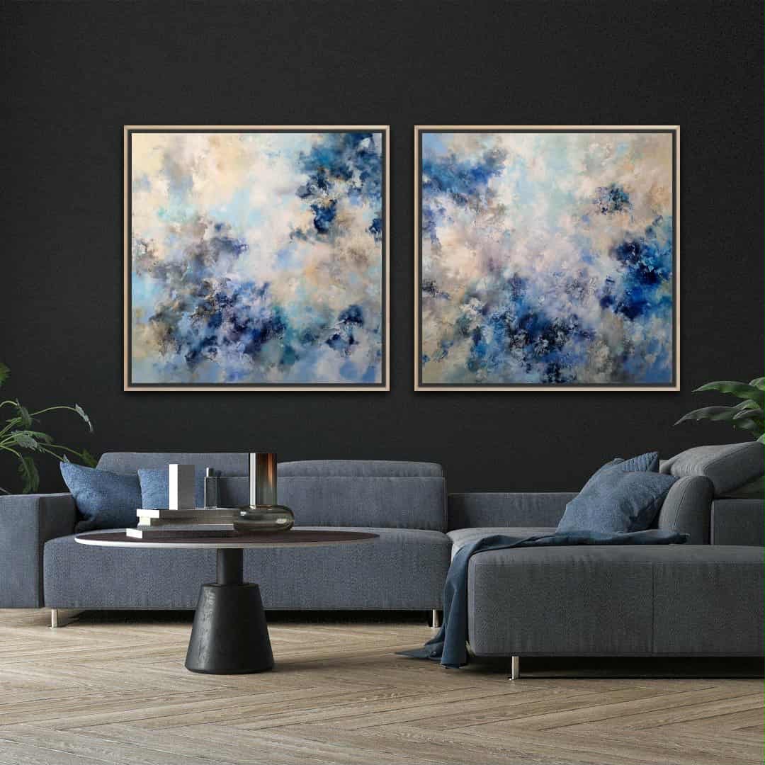 Ocean Above is a serene and immersive diptych inspired by the ever-changing moods of the sea and sky. Layers of acrylic and texture paste build a dynamic surface of light and shadow, where deep indigo and soft turquoise drift through clouds of misty white and sand tones. The interplay of colour and texture evokes the feeling of looking through shifting water or sky—fluid, boundless, and full of quiet movement.