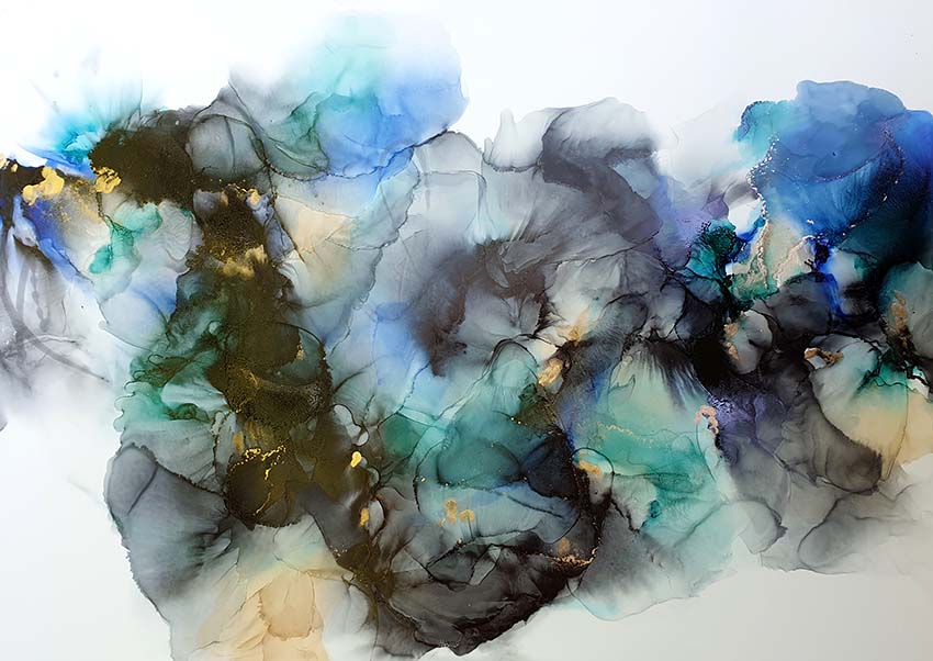 An unframed original artwork created with a calming and soft arrangement of colour across the page. The artwork features beautiful brassy gold highlighting throughout the calming black, blue, green and sand tones.