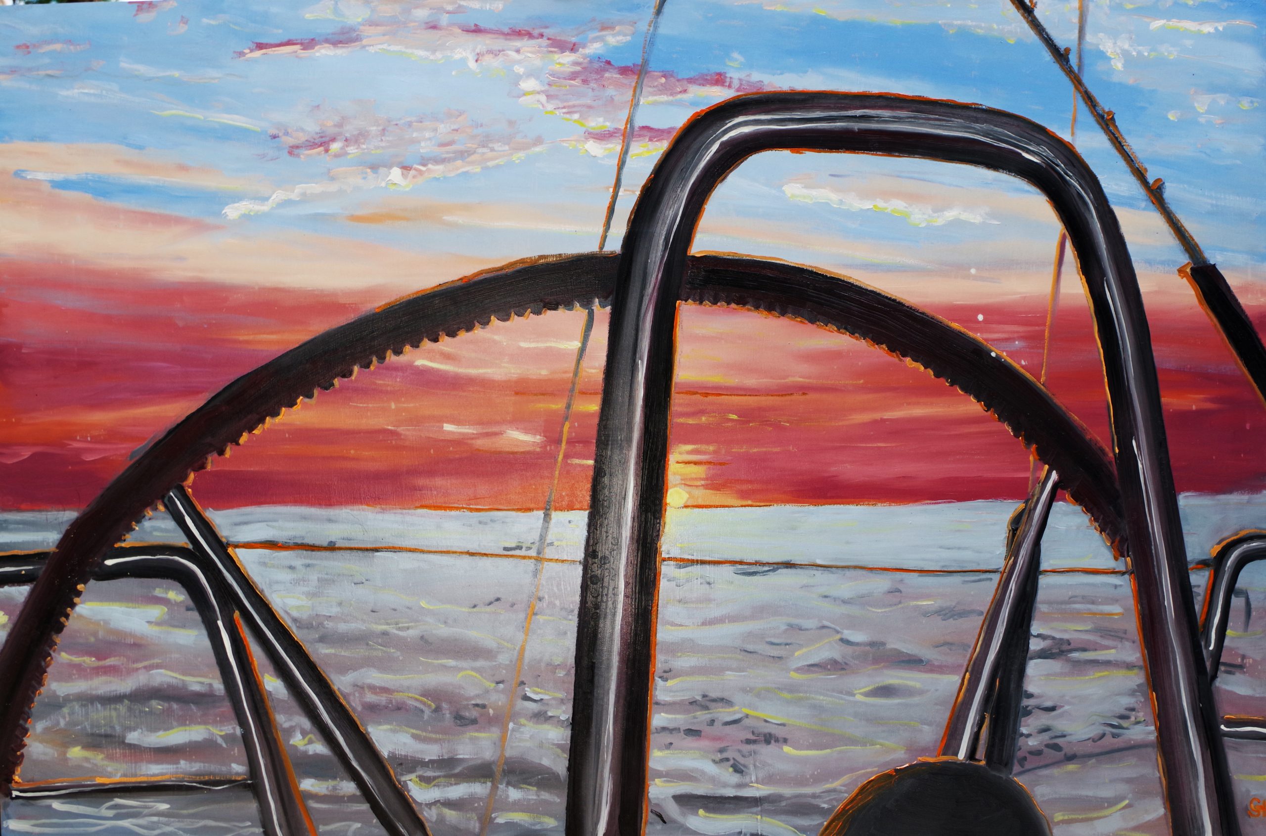 On board the Bavaria 50 ” Whitehaven” crossing the Atlantic. We were a crew of 6, so we divided ourselves into 3 watches of 2 with a watch system that rotated as each day passed. So every 3 days I would be on watch as the sun poked above the horizon. this was one such dawn. Ready to hang with a wire across the back, sides painted Black.
