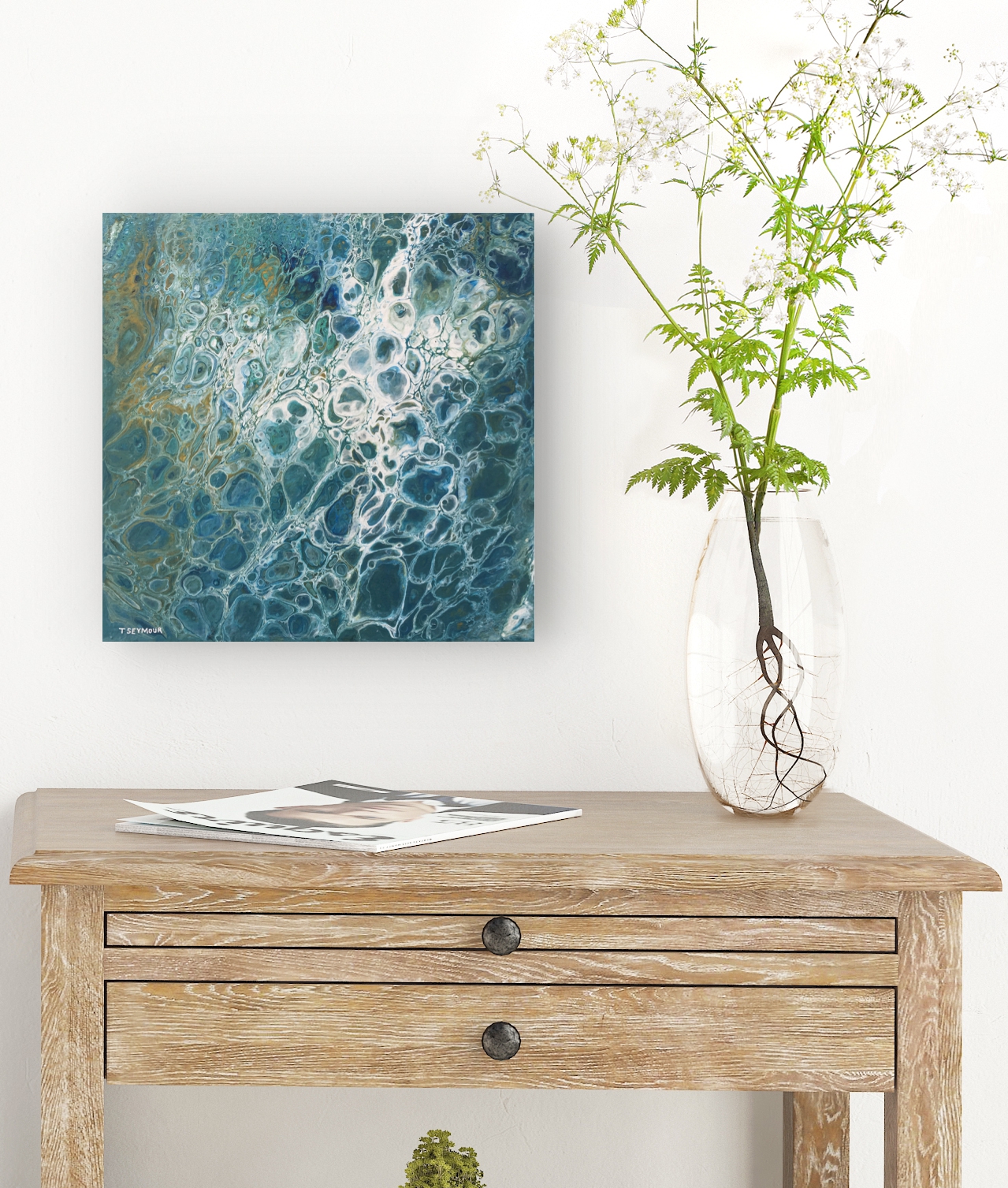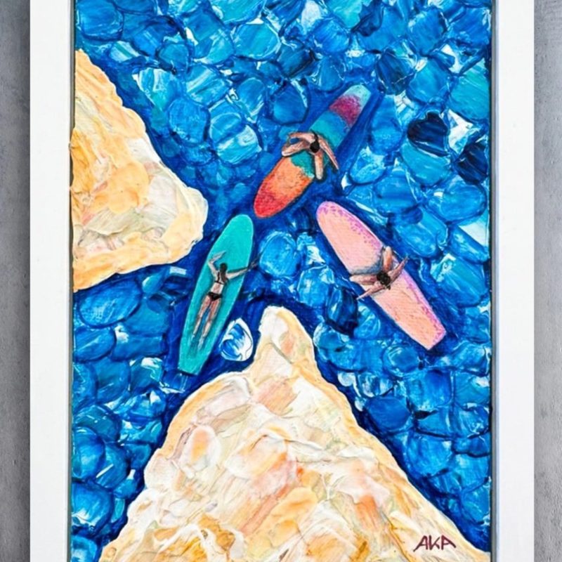 OCEAN ENERGY is part of my OCEAN FOLLY COLLECTION. Great on their own or as a set, these beautiful small acrylic canvases are a tribute to our beautiful oceans which surround our wonderful country Australia. Depending on where you like, the ocean is different not only in looks but in habitat. Waters vary in temperature and so attract different types of marine life and ocean flora. Living by the Bay in Melbourne, I am witness to the ocean changing from a calm “Mill Pond” to a raging surf beach. This particular piece OCEAN ENERGY is a reflection of our northern waters during a tropical storm. The salty waters churning and frothing, creating huge swells in the ocean. A wonderful site from the safety of the stable shoreline.