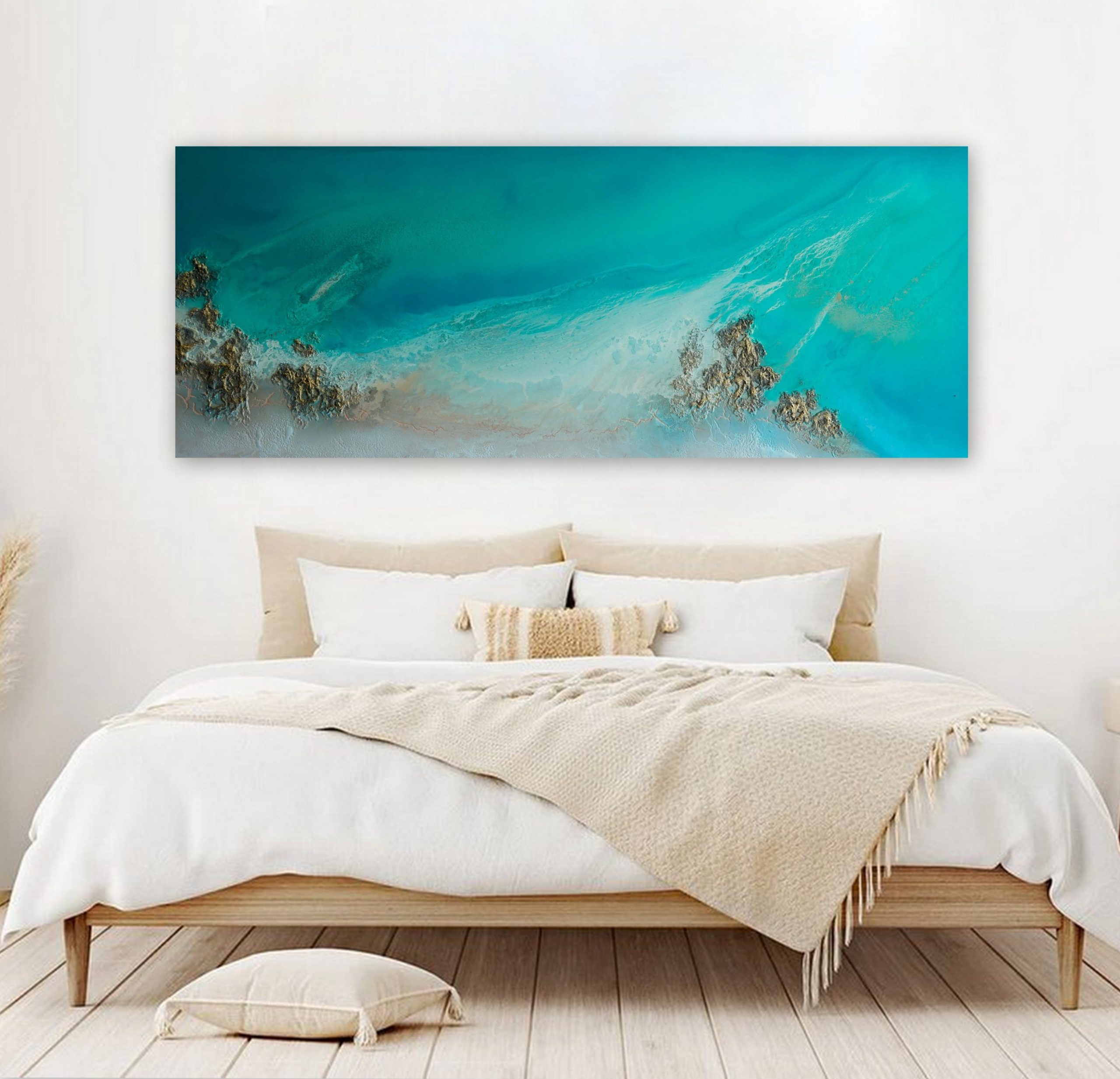 Aqua Abstract Wall Art “Ocean Exhale” by Petra Meikle de Vlas – is a highly textured, 3 dimensional, abstract aerial view of the ocean.