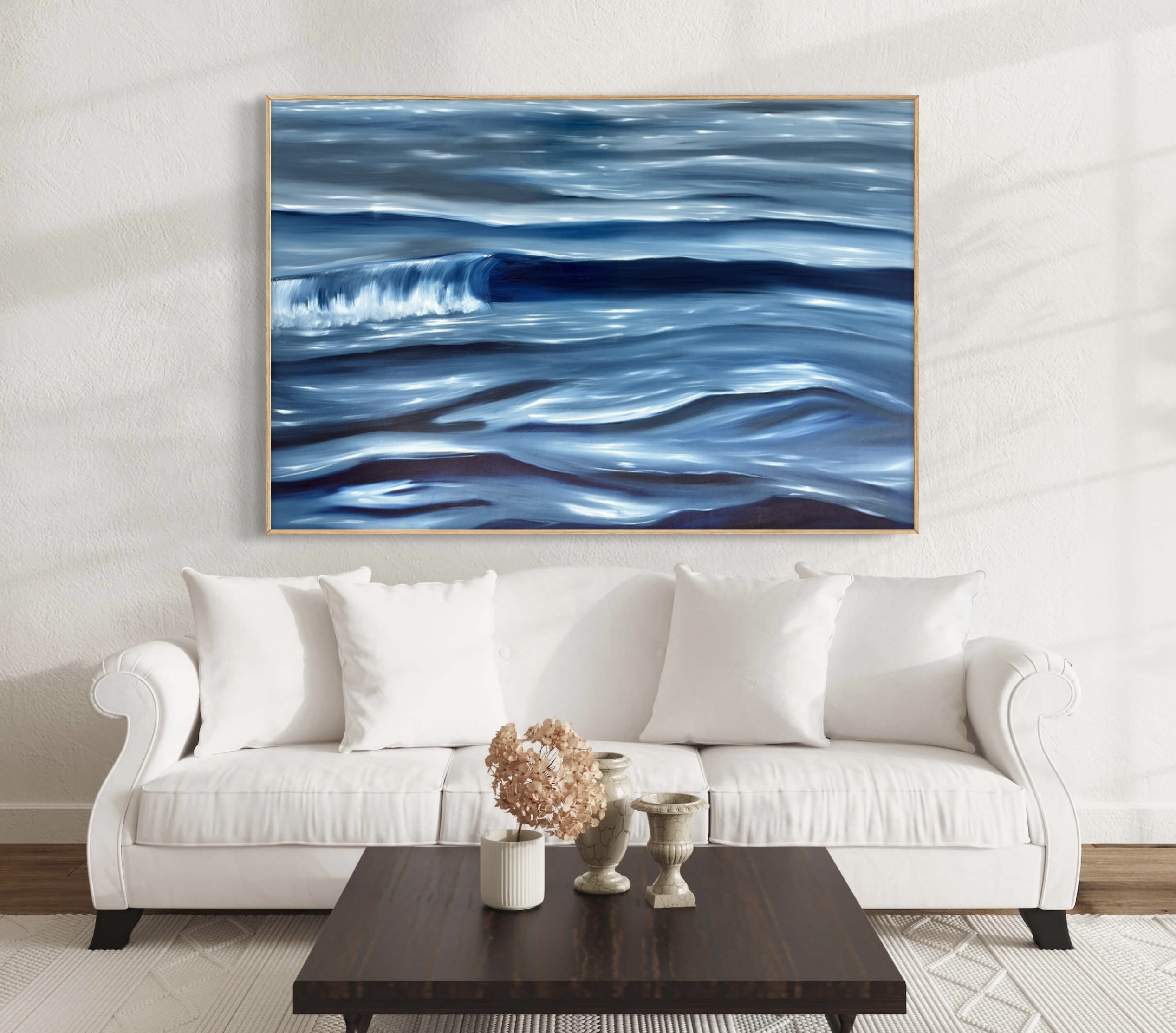 This large realistic ocean painting has abstract painterly feel and will create a calming environment to any space. The edges have been painted to ensure a nice neat finish.