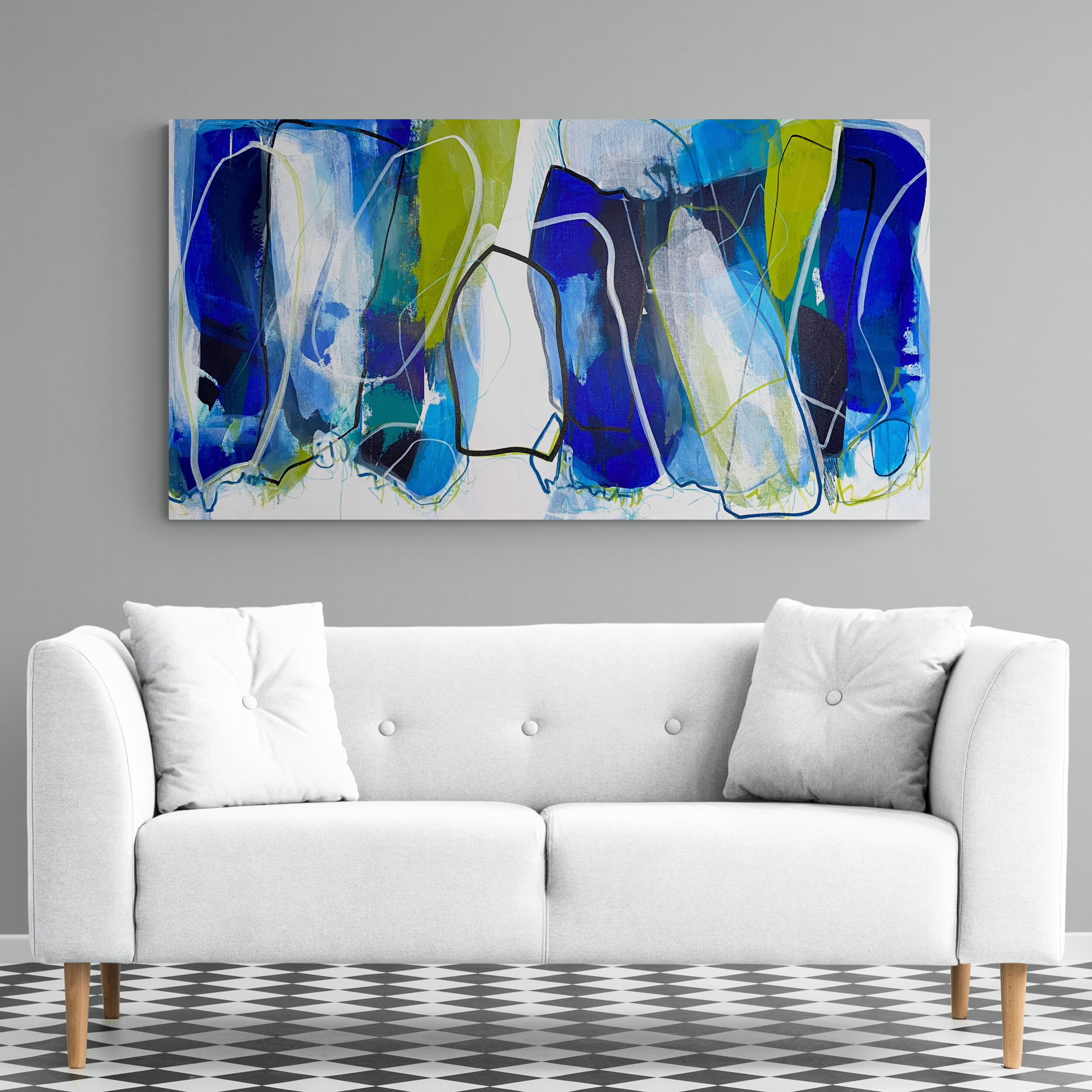 The striking mark making in this large artwork combined with its vibrant seascape palette of dark and turquoise blues, greens, black and white would make the perfect statement piece for any space.