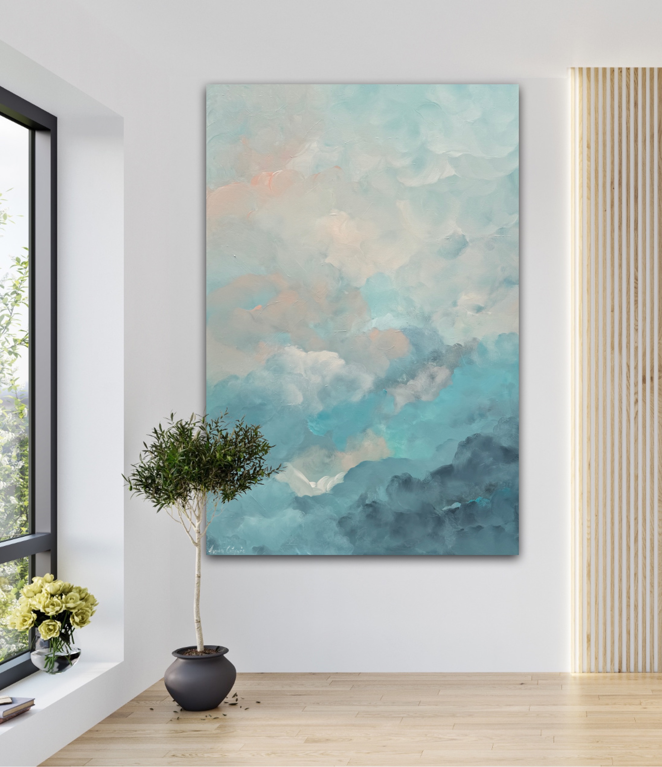 ‘Ocean Mist’ is a soothing abstract painting, featuring soft blends of sky blue, gentle neutrals and misty clouds. This piece brings calm and serenity to any space.
