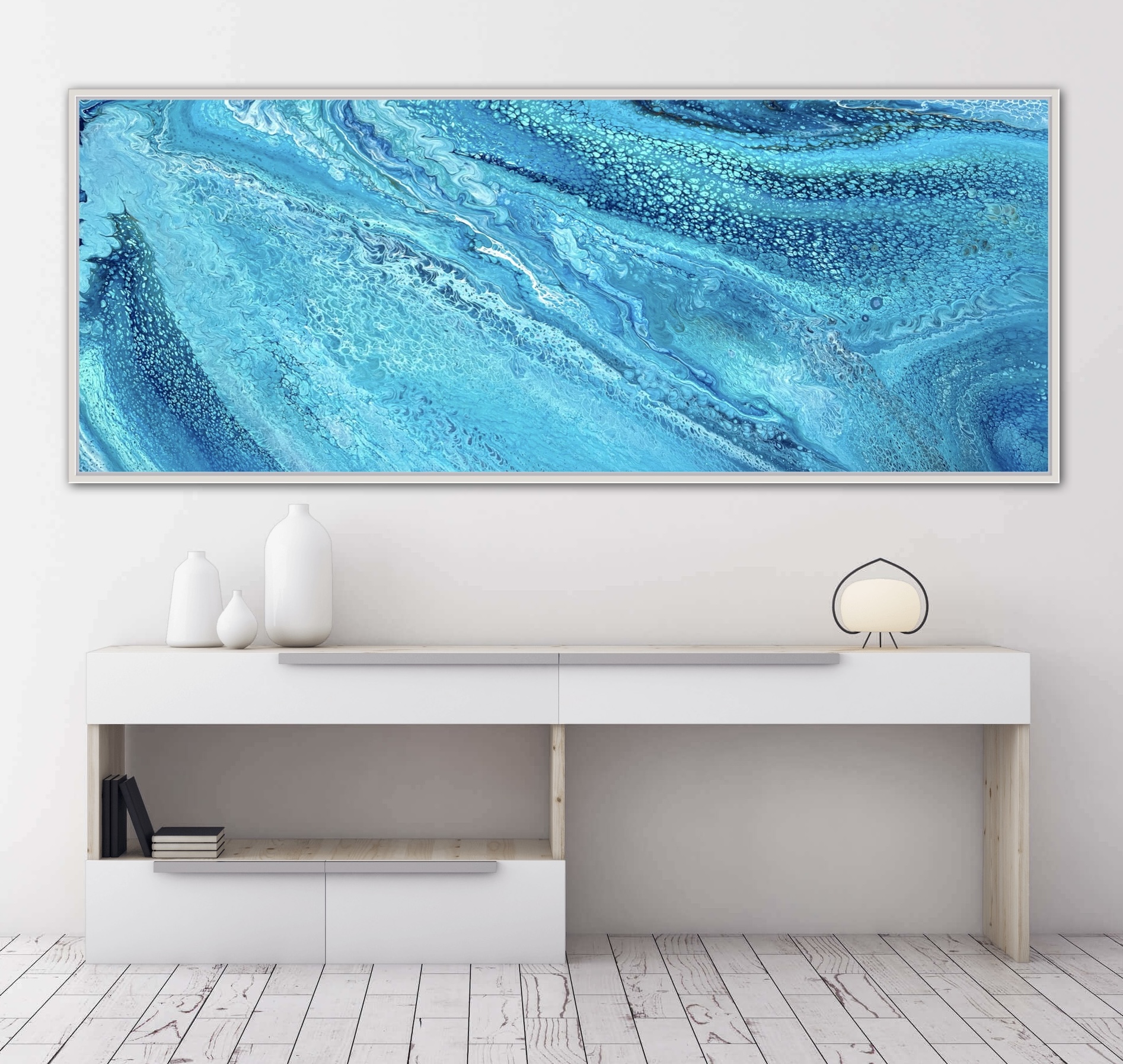 Ocean Serene was created using various techniques combined to allow increased flow, interaction and separation of colours to create interesting patterns where pops of colour can be seen emerging from underneath. This added dimension adds lace and cells to the artwork creating an interesting and one of a kind painting that can never be replicated.