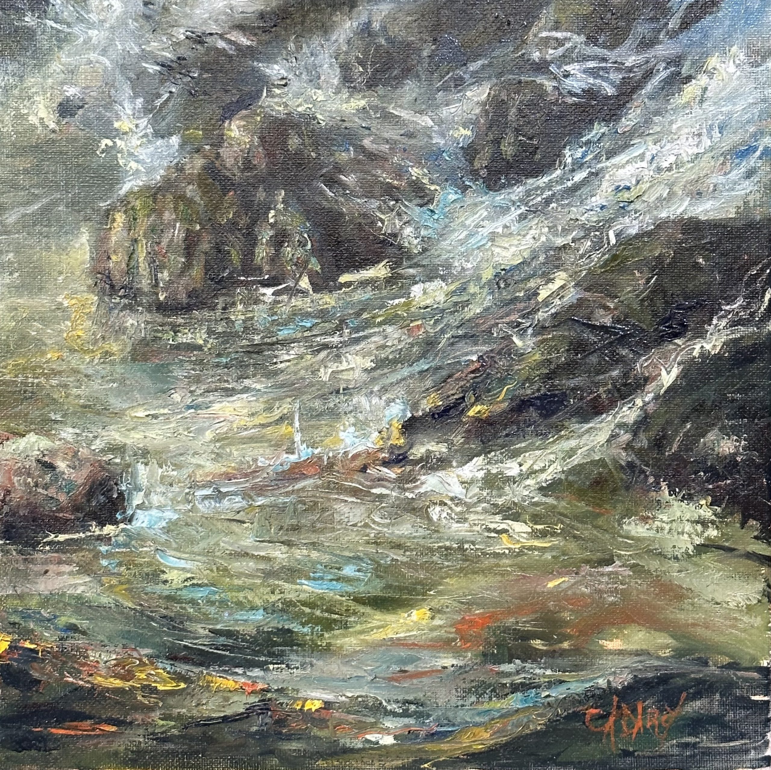 The concept of the painting was to describe the movement on the ocean shore and the energy of the waves surging over the rocks using beautiful brushstrokes and palette knife.
