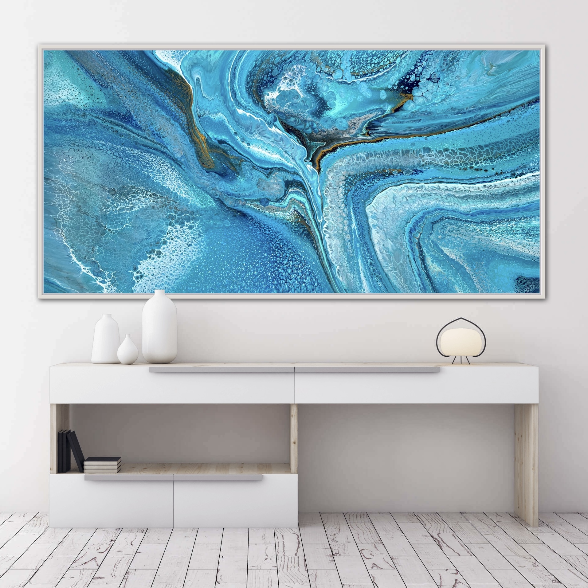 Ocean Unbound was created using various techniques combined to allow increased flow, interaction and separation of colours to create interesting patterns where pops of colour can be seen emerging from underneath. This added dimension adds lace and cells to the artwork creating an interesting and one of a kind painting that can never be replicated. The metallic paint used reflects the shifting light beautifully really bringing the painting to life.