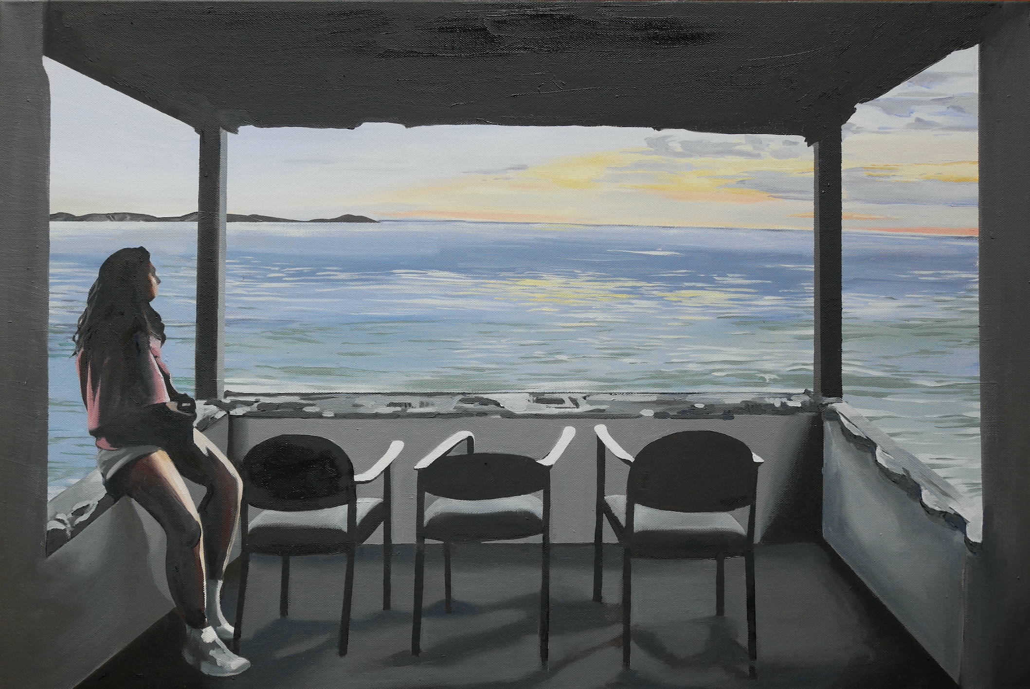 “Ocean Viewing” by Nikki Frankel is painted in oil on canvas. This painting is set in Queenscliff, Victoria, overlooking the ocean from an old concrete fort built during World War 2. The fort, backlit against the ocean creates a cinematic experience, framing the view of the ocean at sunset. The three empty chairs in the foreground lined up in the old concrete fort, weathered with age is a curious setting for this young woman, who sits alone in her thoughts. The ocean as is the experience life itself, an unstoppable force of nature, ever changing, however in this painting there is a calm and an appreciation of the present moment, as if time is paused for a brief moment as the the sun sets over the horizon.