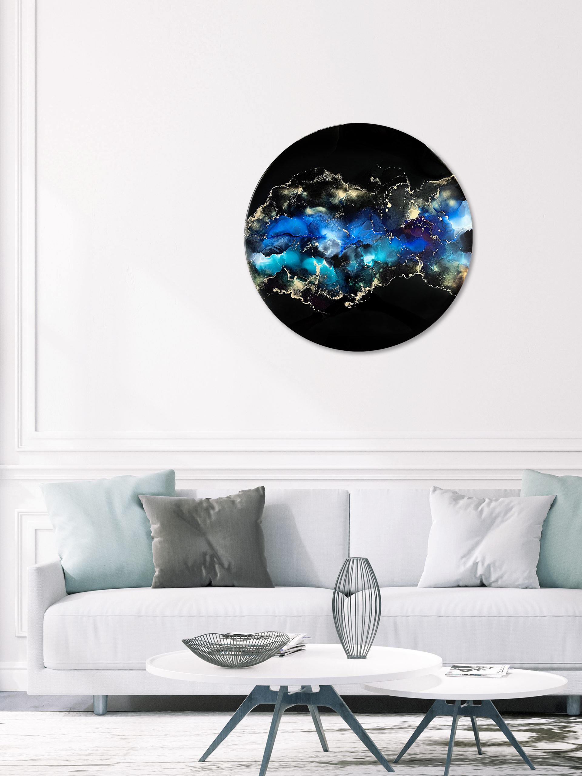 Vibrant colours shining against this deep, dark black highlighted with ribbons of metallic gold sparkling in this deep space