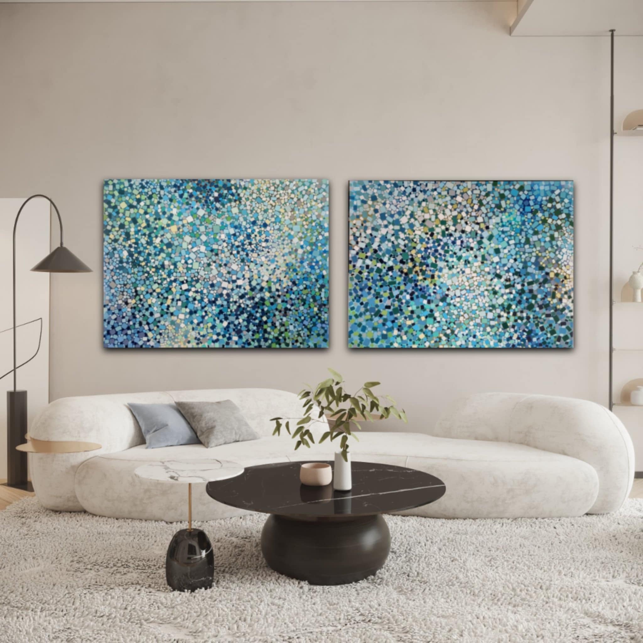 This is a listing for a diptych. Each piece measures 91x122x4 cm. They can be hung next to each other or separated—for example, along the stairway or a long wall, on each side of the door, or on different panels. They also can be displayed horizontally or vertically. I believe this flexibility is an incredible advantage. These paintings are also offered for sale in different combinations in separate listings.